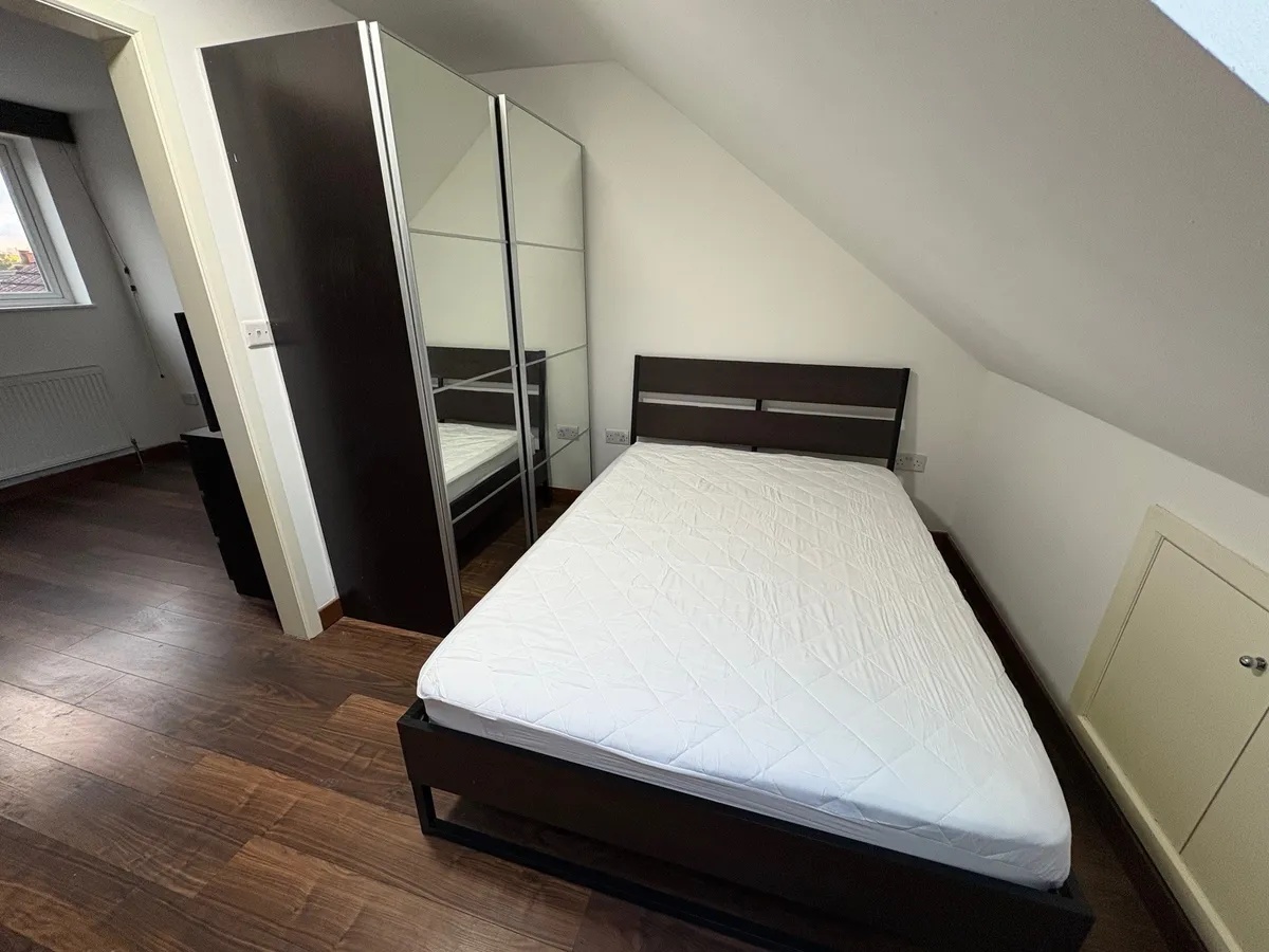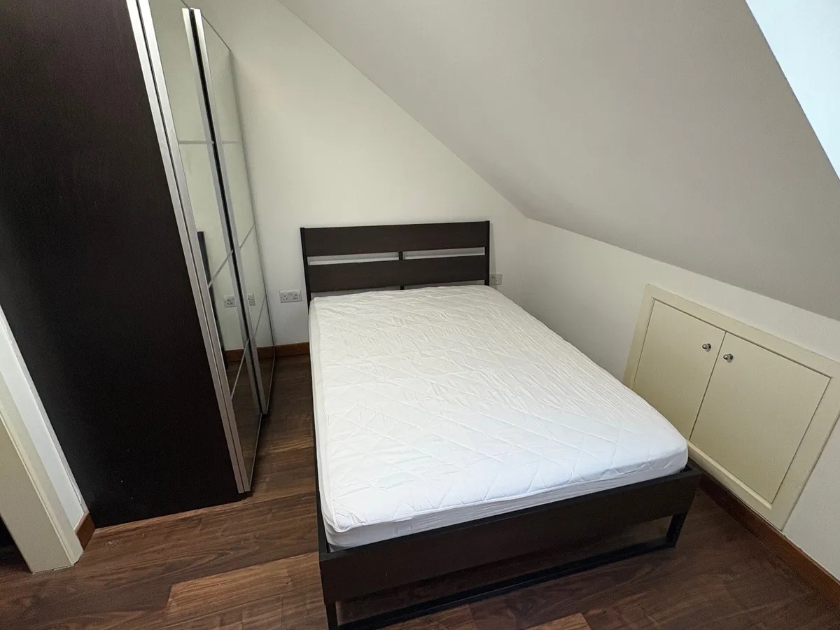 Includes a comfortable double bed, a large mirrored wardrobe for ample storage, and additional built-in eaves cupboards.