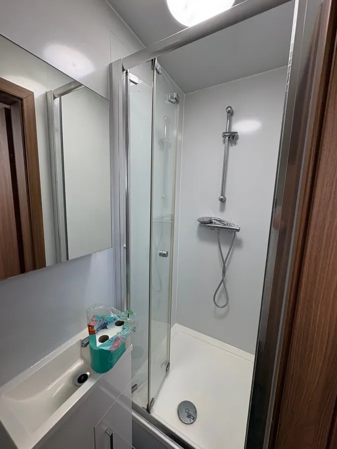 A modern, private bathroom featuring a glass-enclosed shower, vanity sink unit, and a heated chrome towel rail.
