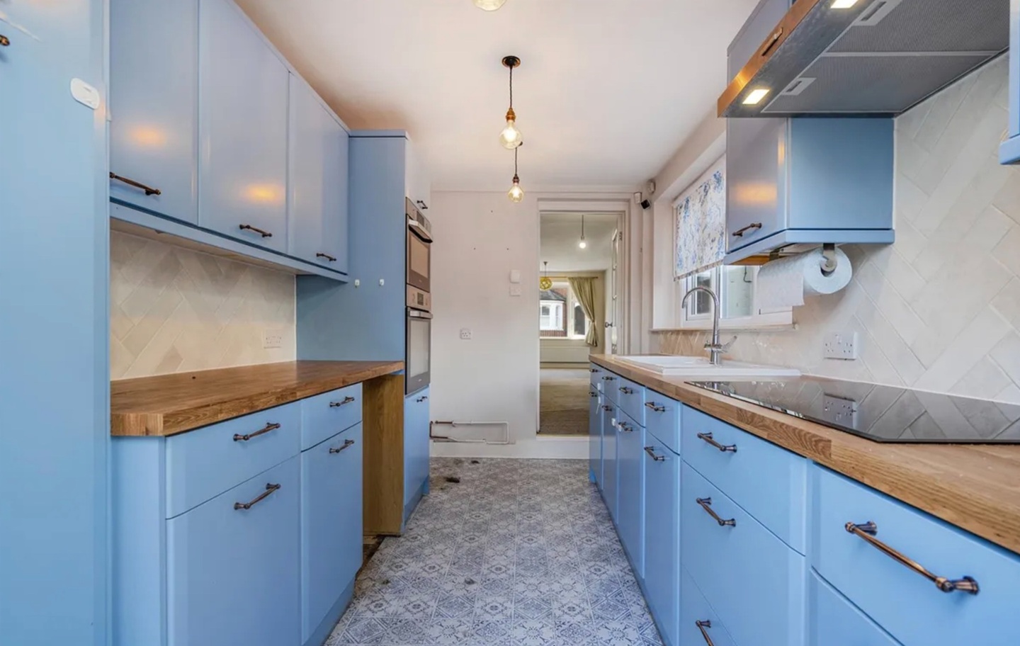 The ground floor has a living and dining room with an open fire, and a kitchen with access to private garden.