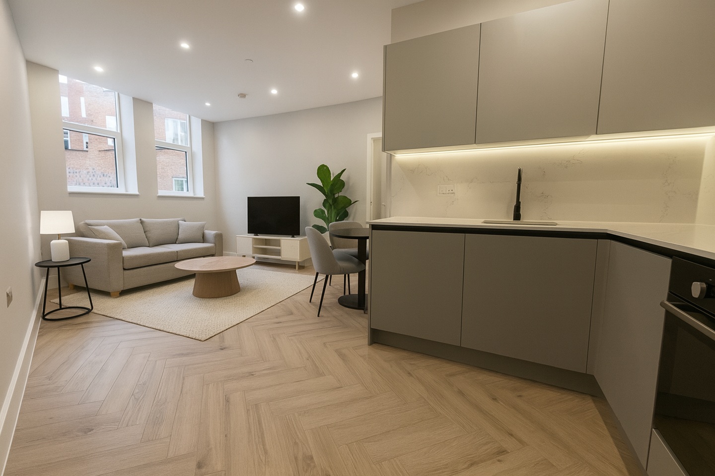 Step inside this beautifully finished two-bedroom apartment and you’ll instantly see the difference. From the soft, plush grey carpets in the bedrooms to the stylish herringbone-effect hard flooring through the living space, every detail has been thought through.