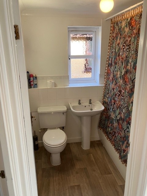 Bathroom, being on the outside wall has natural ventilation by way of an openable window. Pressurised water tank providing a really good shower flow rate.