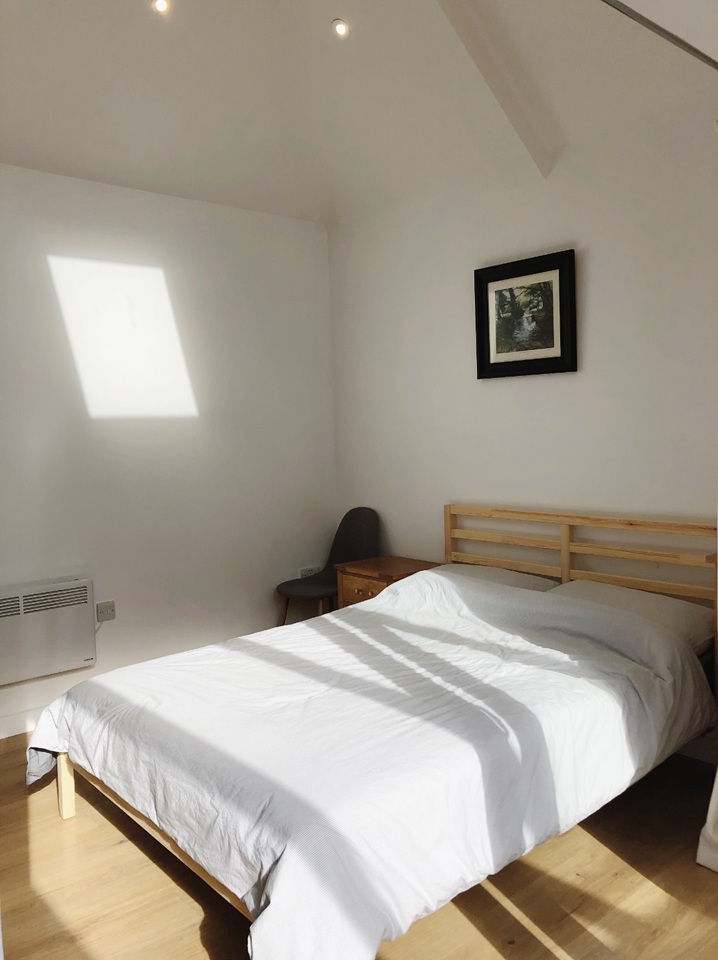 The property makes for the perfect home for a young professional. The open plan with minimalism and modern finish allow for versatile functions/areas. Abundant natural light flooding through three roof windows. The ergonomically designed kitchen and brand-new shower cubic provide modern comfort and efficient lifestyle. The kitchen has solid oak countertop, plenty storage and cupboard space, cooker and oven, microwave and fridge, as well as a dining table and chairs. Modern touches like , VELUX Windows and highly-efficient insulation throughout. Table, chairs, microwave, cooker, fridge, storage cabinet, cooking utensils and bed included. Bedding can be included upon request.