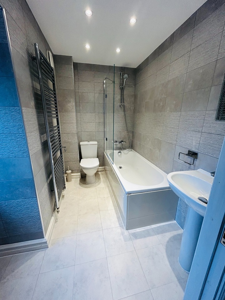 • Sleek family bathroom – featuring a bathtub with overhead shower, wash hand basin and WC.