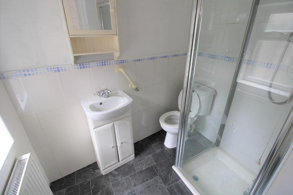 Vinyl flooring and walls. Three-piece shower suite to include a shower cubicle, wall mounted hand basin, low level W.C. and an extractor fan. Double glazed frosted window to rear.