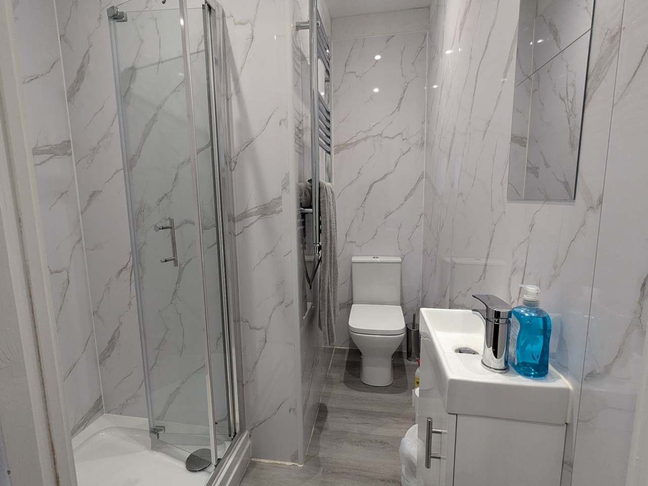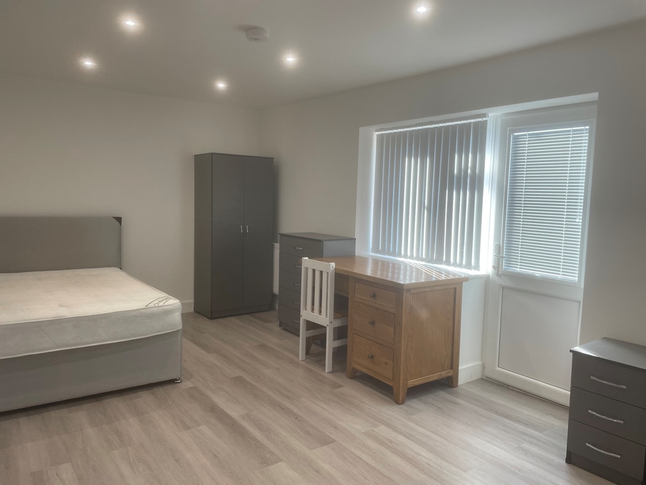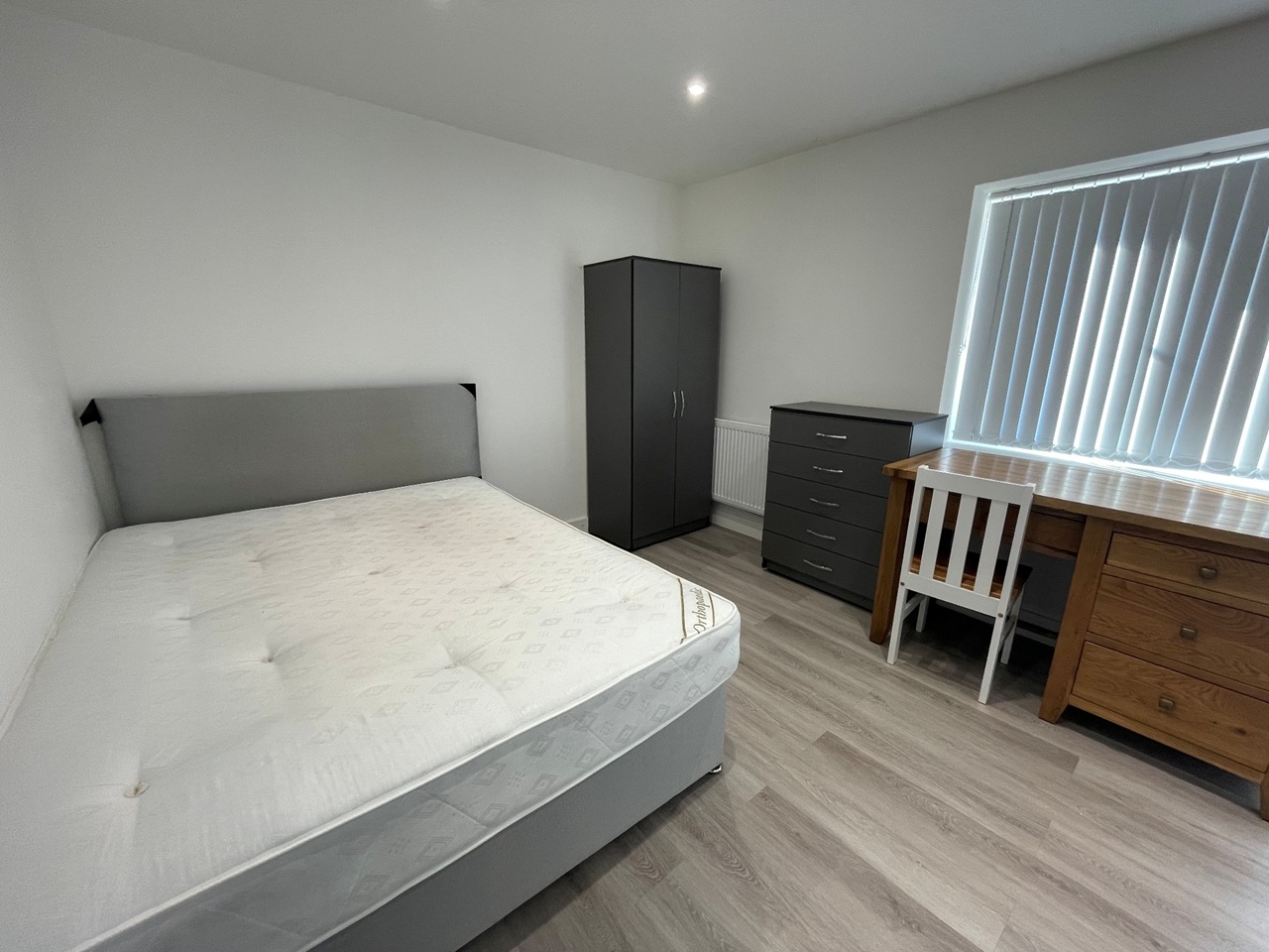 The property also includes a brand new, fully equipped communal kitchen and dining area, complete with a fridge/freezer, washing machine, dryer, two sofas, dining table with chairs, and a breakfast bar with stools. A communal garden area is available for tenants, and there is unrestricted on-road parking.