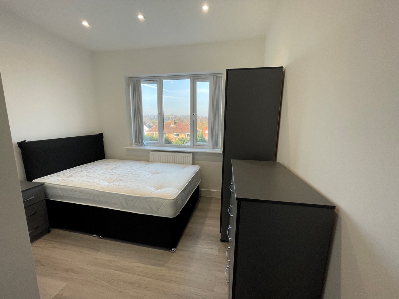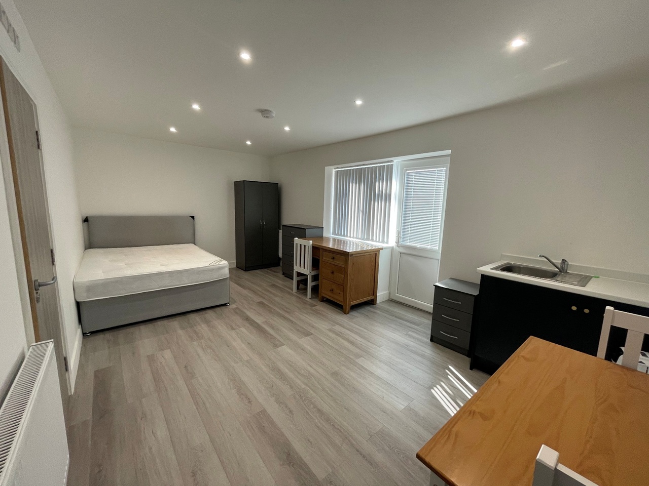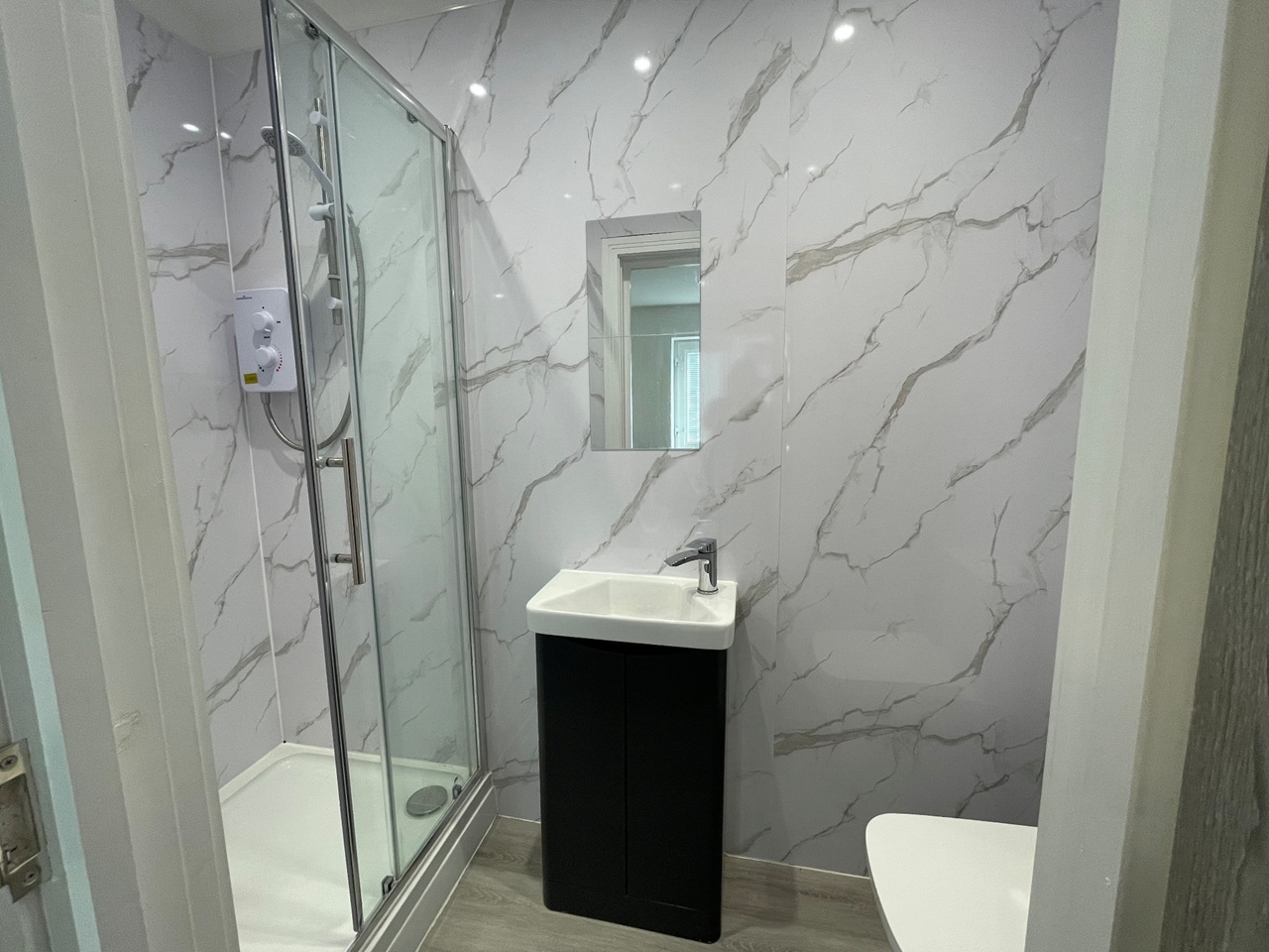The property also includes a brand new, fully equipped communal kitchen and dining area, complete with a fridge/freezer, washing machine, dryer, two sofas, dining table with chairs, and a breakfast bar with stools. A communal garden area is available for tenants, and there is unrestricted on-road parking.