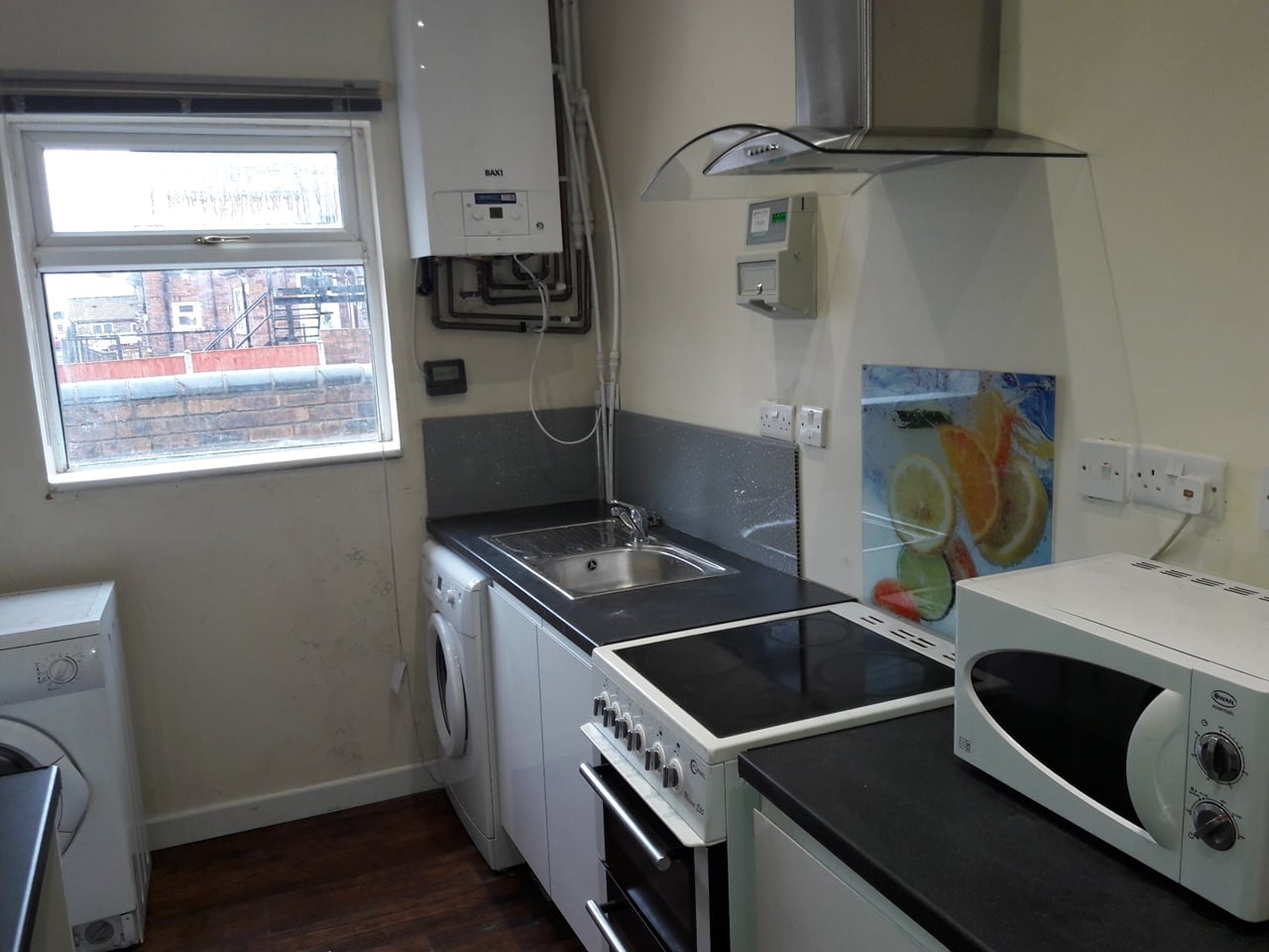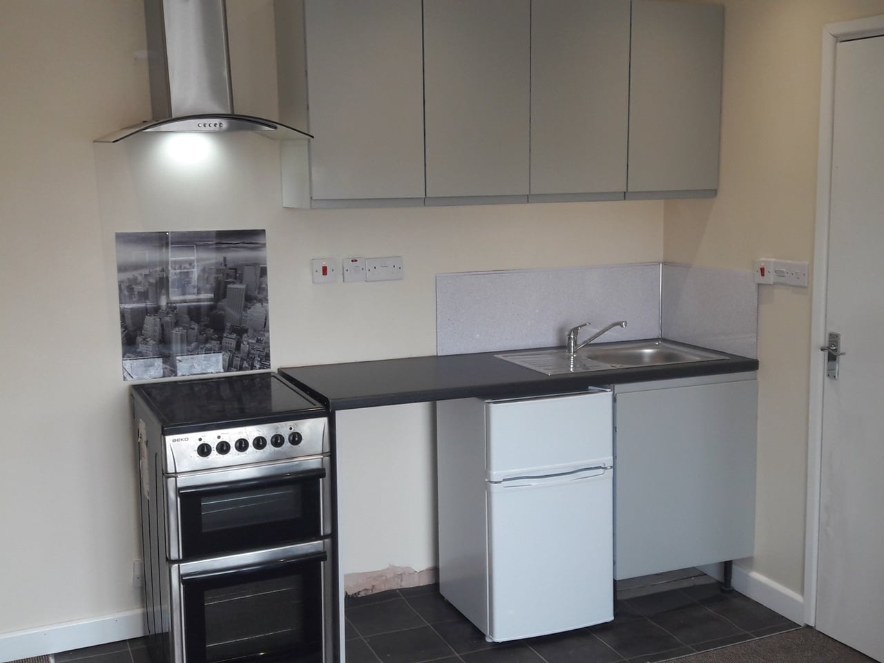 The studio is a good size and fully furnished. The kitchen area has a Cooker, Firdge/Freezer, Sink, Extractor whilst the living area has a desk, sofa, smart TV. The bedroom has a double bed, mattress, 2 wardrobes and a private ensuite bathroom. There is a communal coin operated laundry room and yard at the rear.