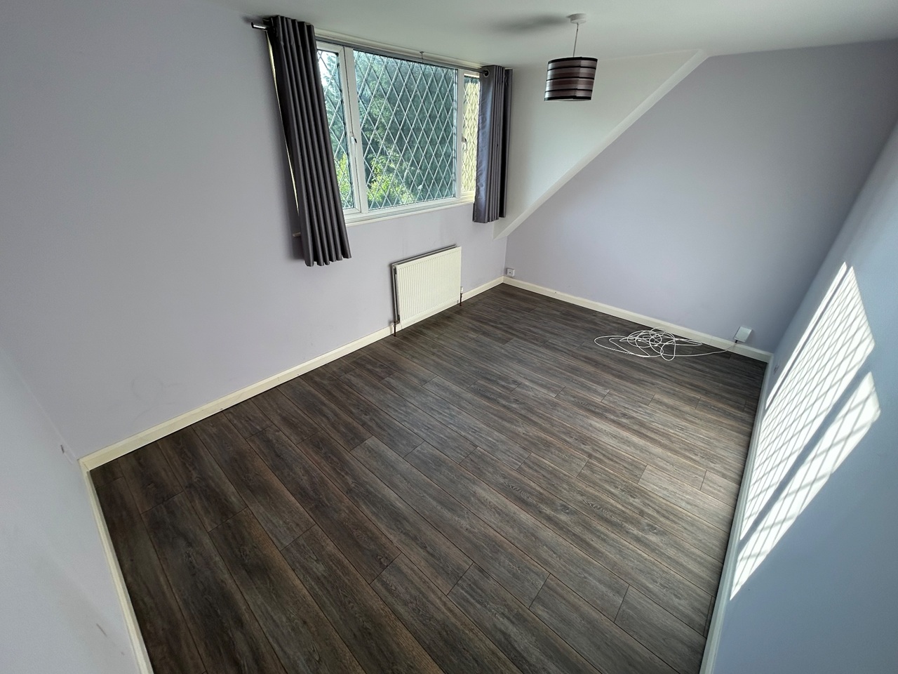 The first floor comprises two large bedrooms and the main bathroom. The primary bedroom, located at the rear of the property, offers a tranquil view of the garden through its large window. Bedroom two, positioned at the front of the home, is equally spacious and bright. The bathroom includes a bath with overhead shower, sink, and WC, finished in a clean, functional style. There is also a useful storage cupboard on the landing.