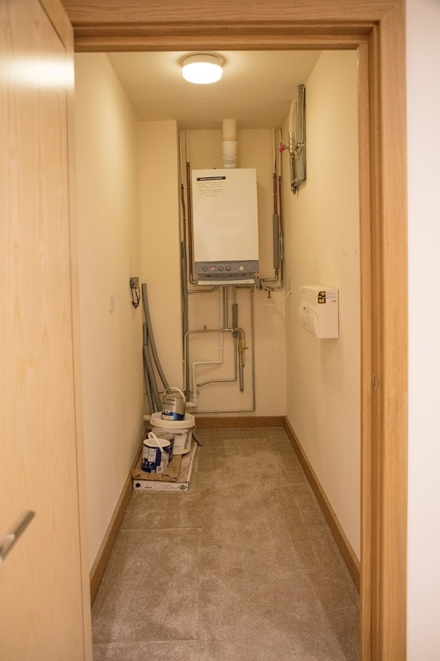 Radiator, video entry phone, storage cupboard housing boiler, doors to