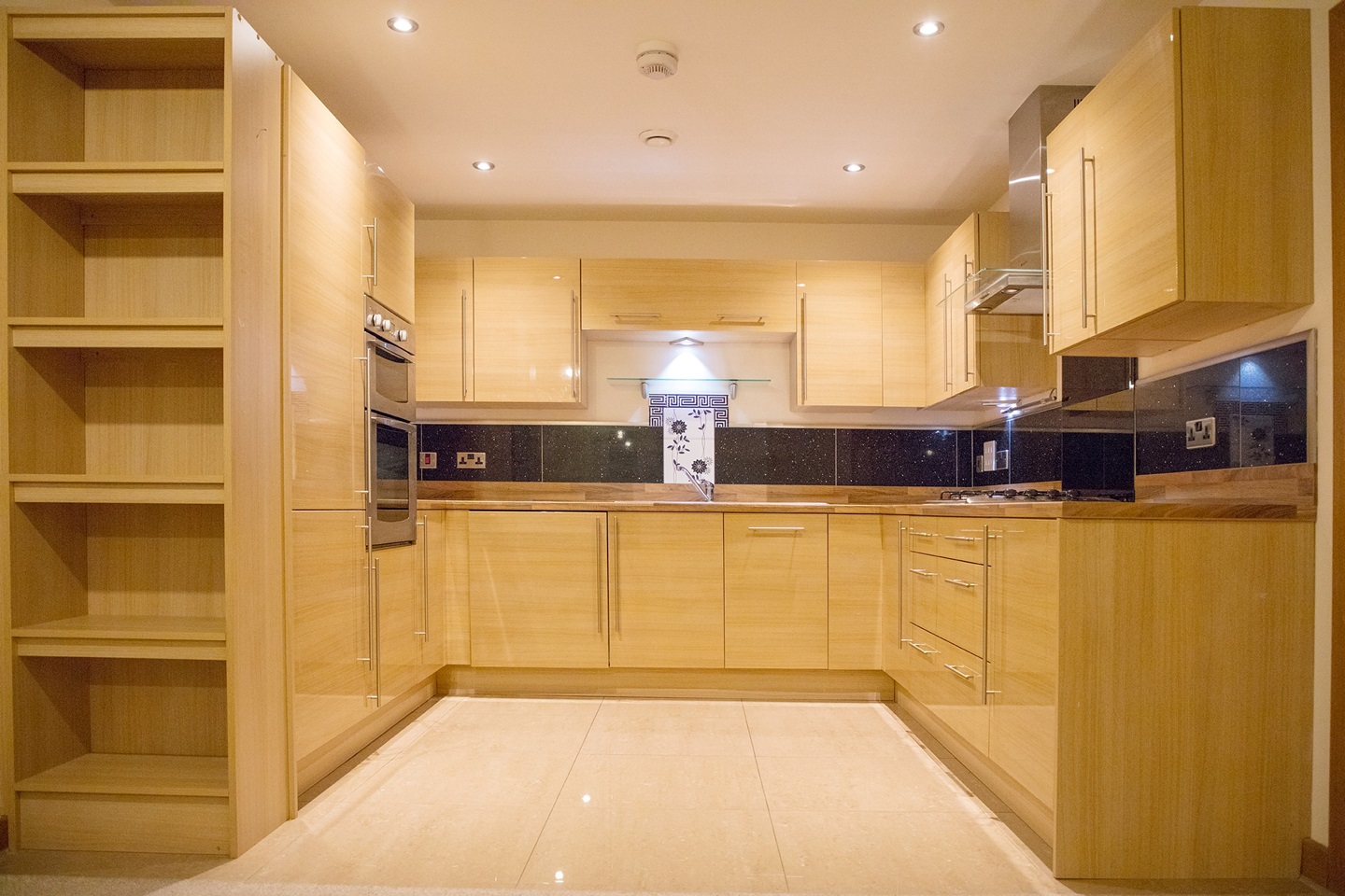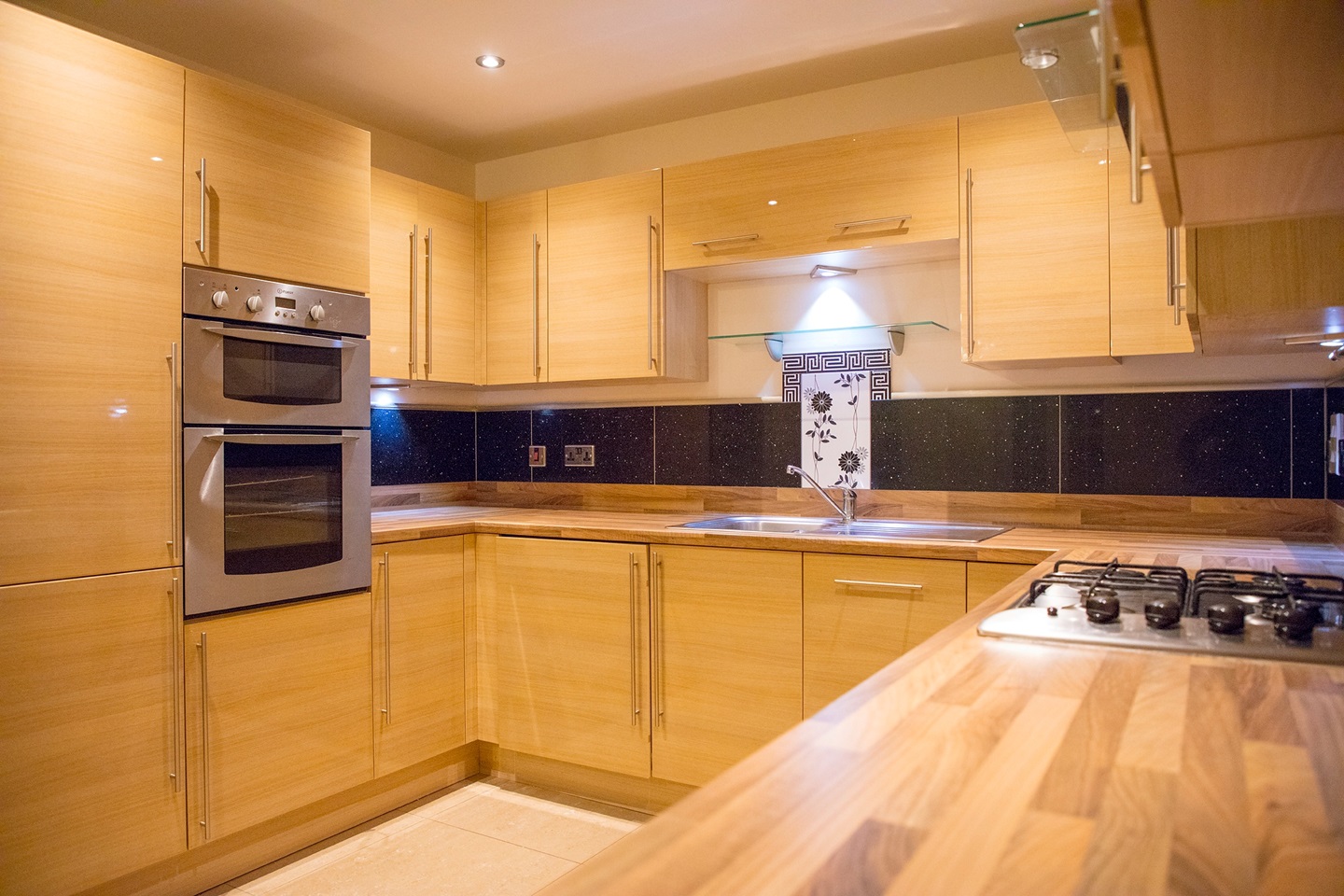 Fully tiled flooring, range of eye and base level units and drawers, built-in washer/dryer, cooker with gas hob, fridge freezer and dishwasher. Work surface above with stainless steel sink and drainer.