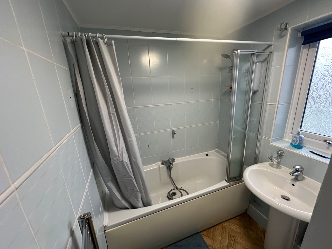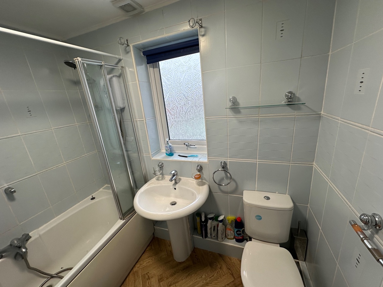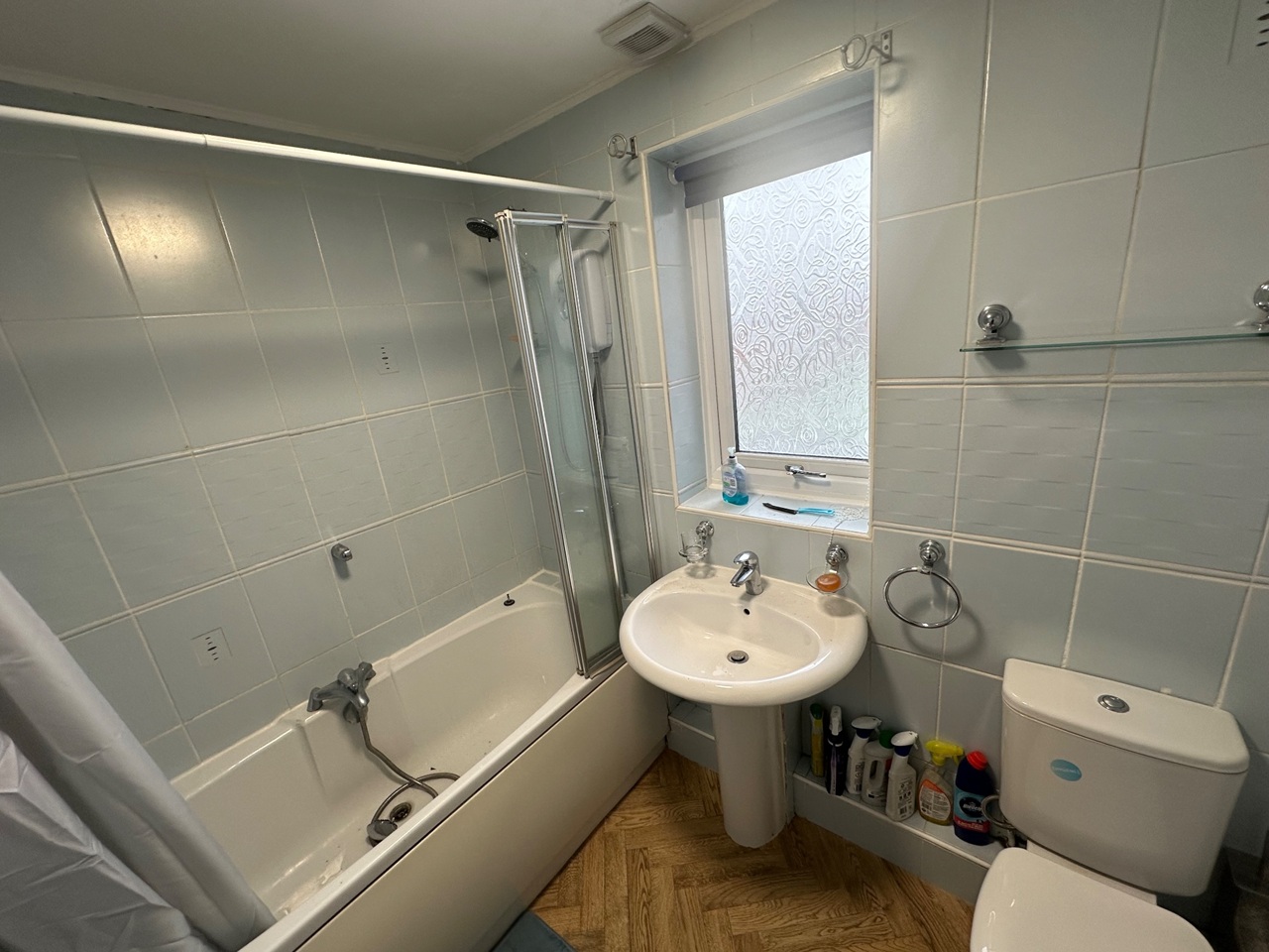Bathroom inc WC, bath & overhead electric shower, sink basin.