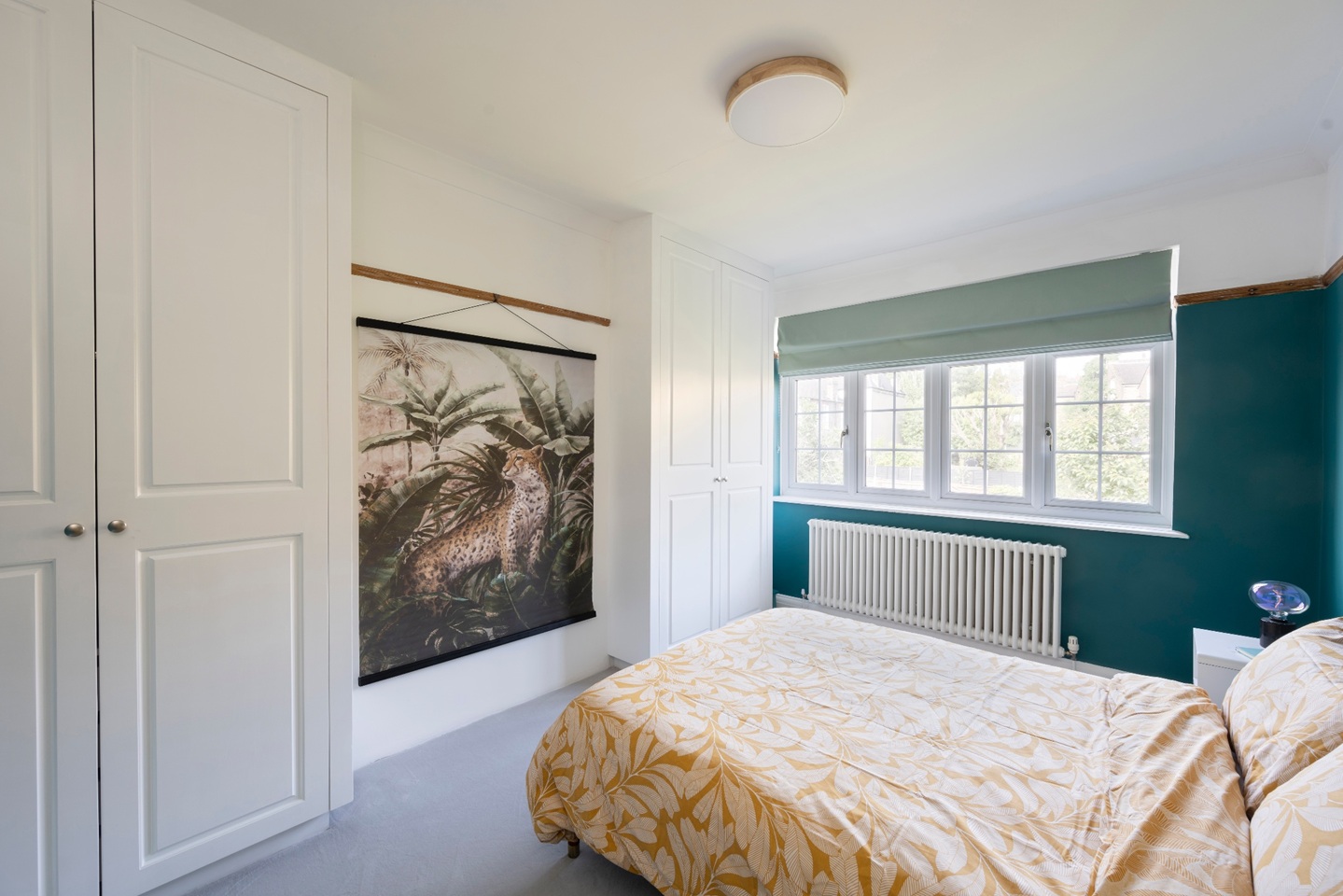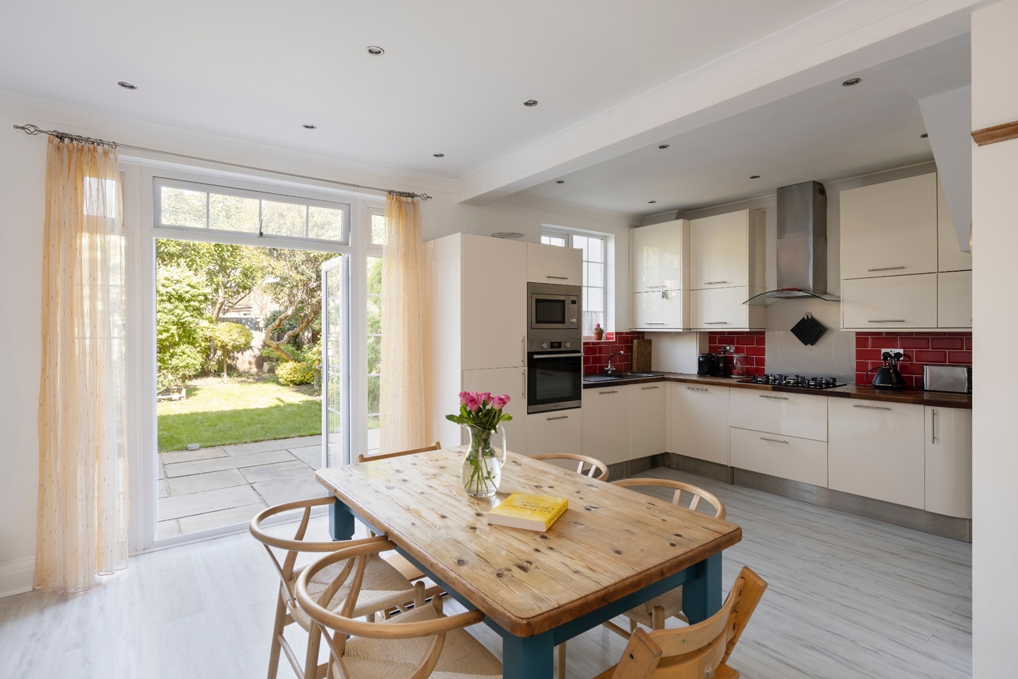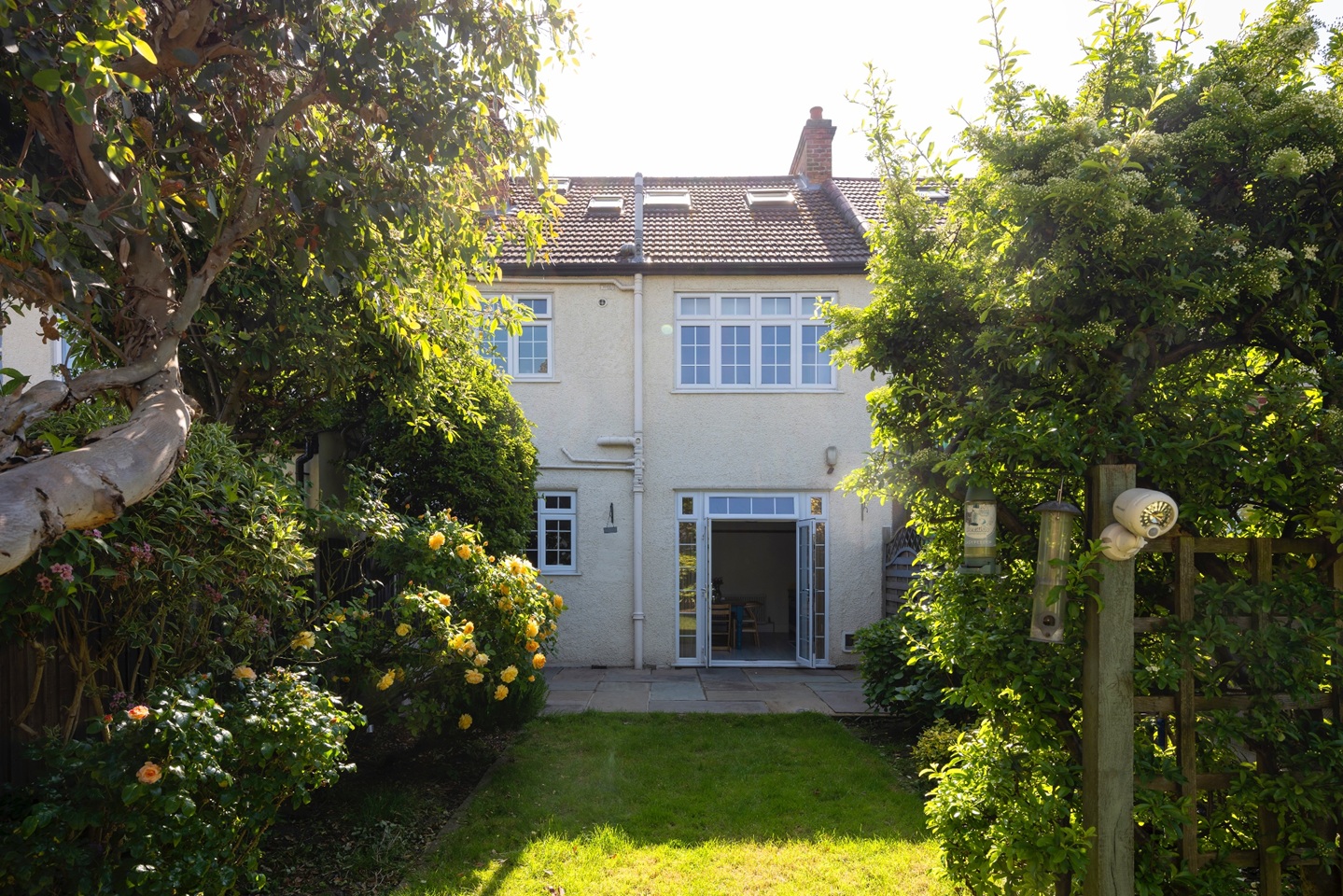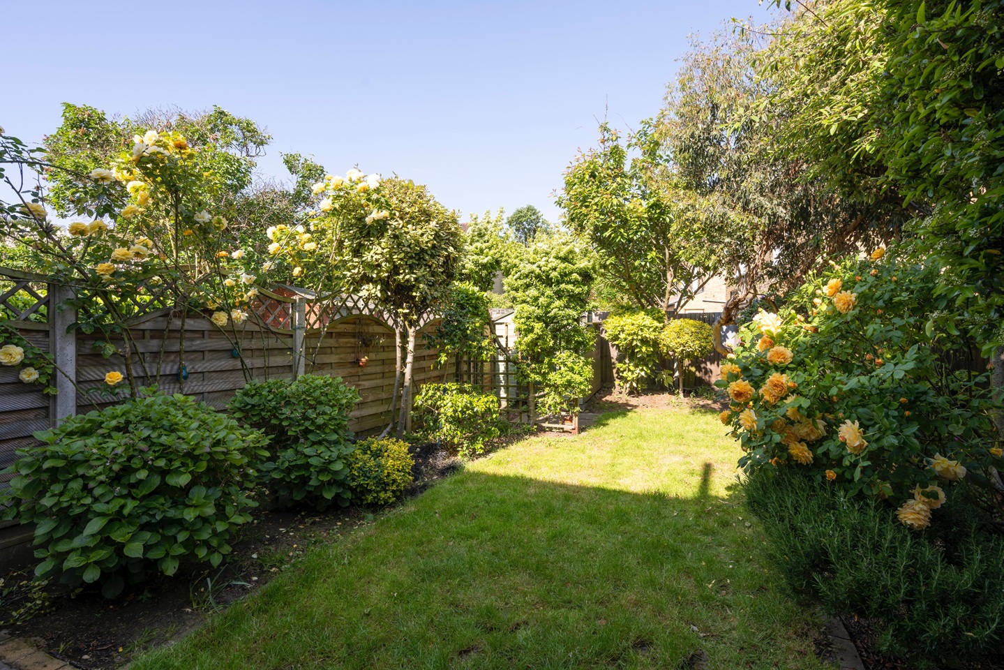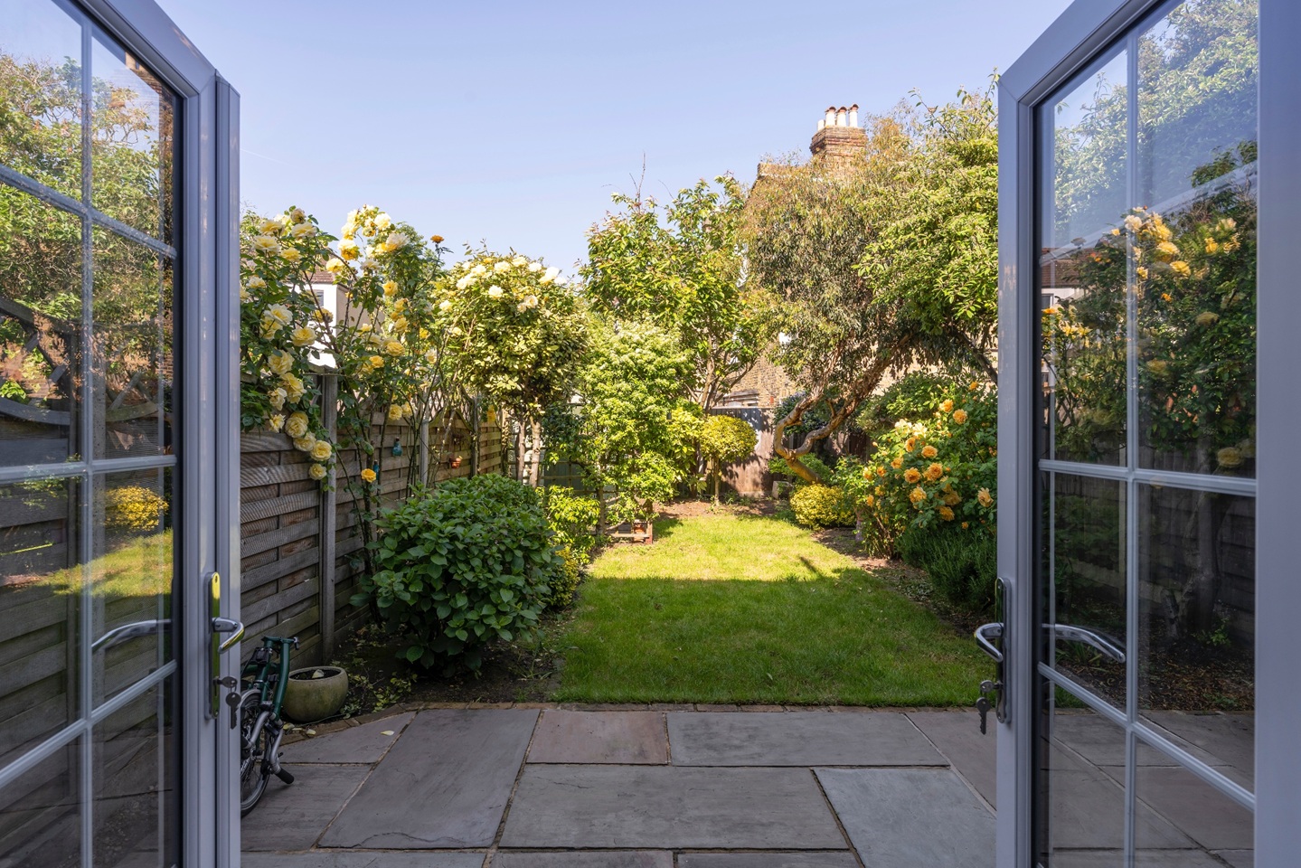 Outside, a serene west-facing garden provides a perfect spot for outdoor relaxation.