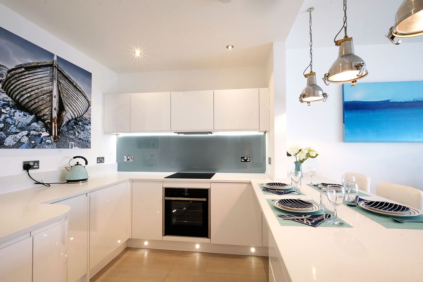 - Fully equipped open-plan kitchen with quartz worktops