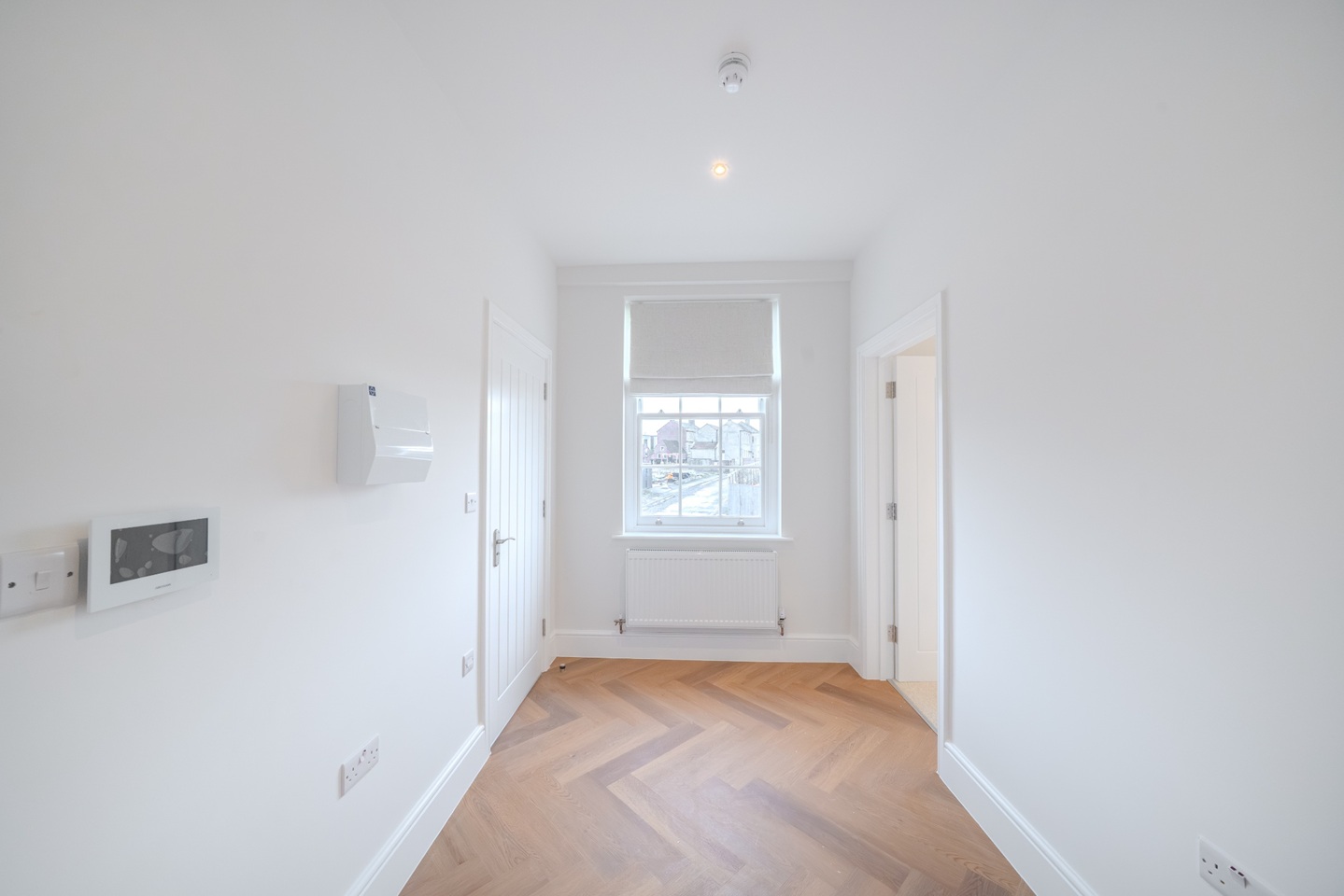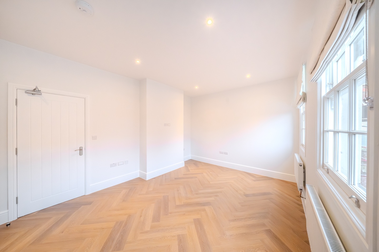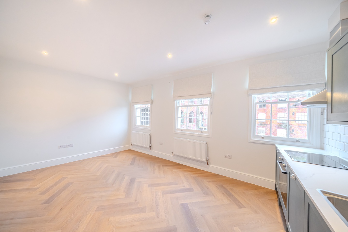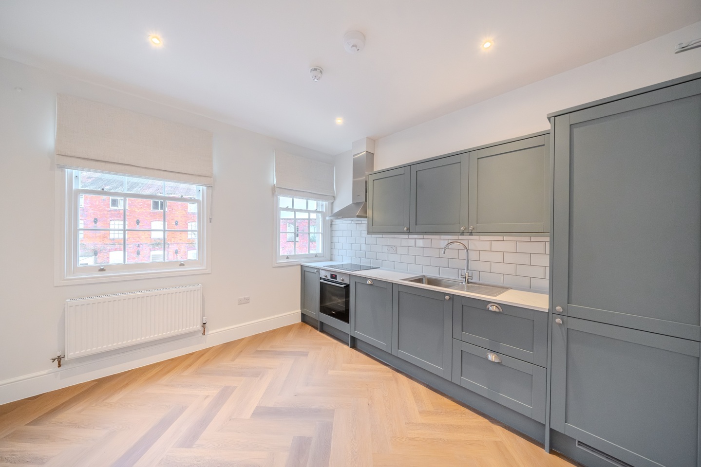 The apartment offers a generous open-plan kitchen and living space filled with natural light from traditional sash windows. The kitchen is finished to a high specification with integrated appliances, contemporary cabinetry, white metro-tile splashbacks and solid worktops, complemented by elegant herringbone wood flooring.