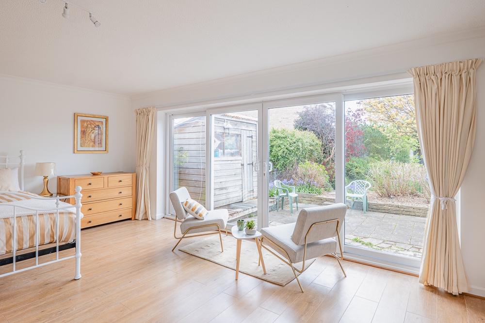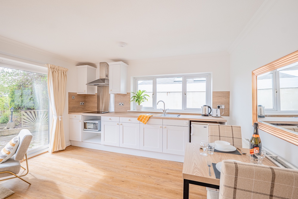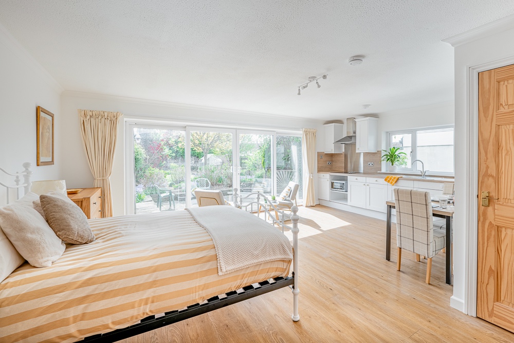 THE STUDIO APARTMENT - Forming part of a new professional HMO next door. A Ground floor bright studio apartment with wood style flooring throughout. A dual aspect room makes for an abundance of natural light, large patio doors lead onto a pretty private terrace. Ideal for a couple, the apartment has an ensuite. The Studio is thoughtfully furnished with an integrated kitchen with dining table, full-height wardrobe, writing desk and ample drawer storage. High ceilings make this space inviting.