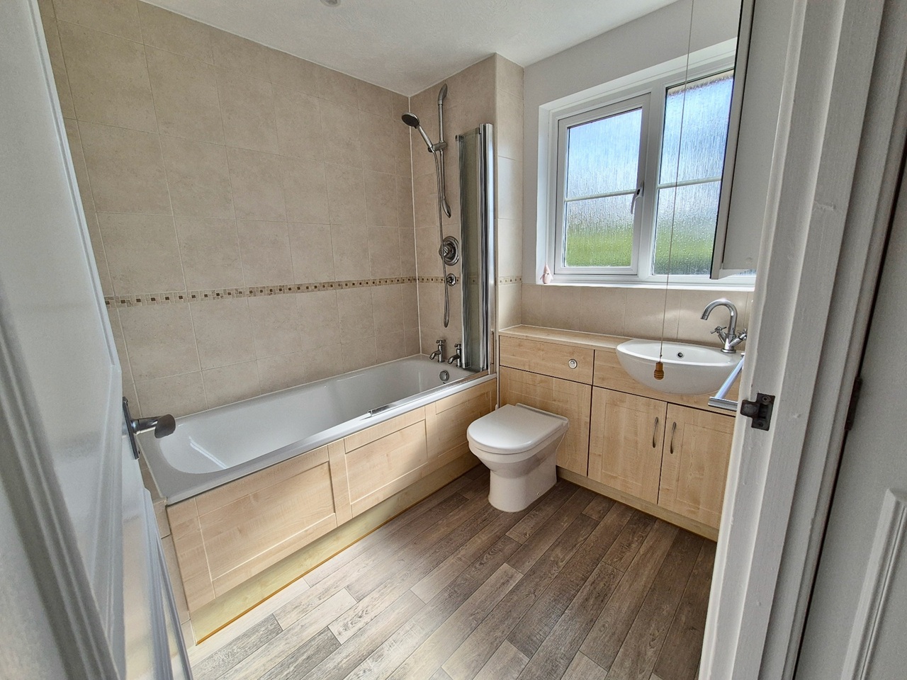 BATHROOM Aqualisa thermostatic shower over bath, shower screen, heated towel rail, mirrored cabinet and shaving point.