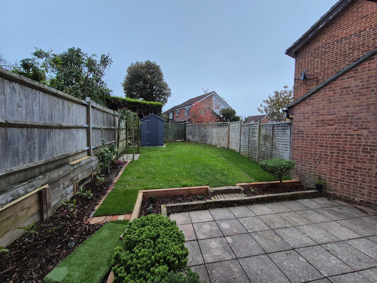 OUTSIDE Fully enclosed rear garden laid mostly to lawn with patio.