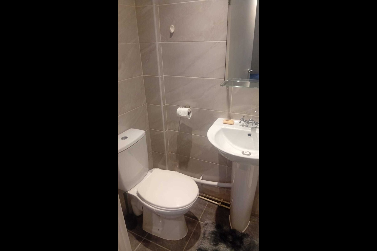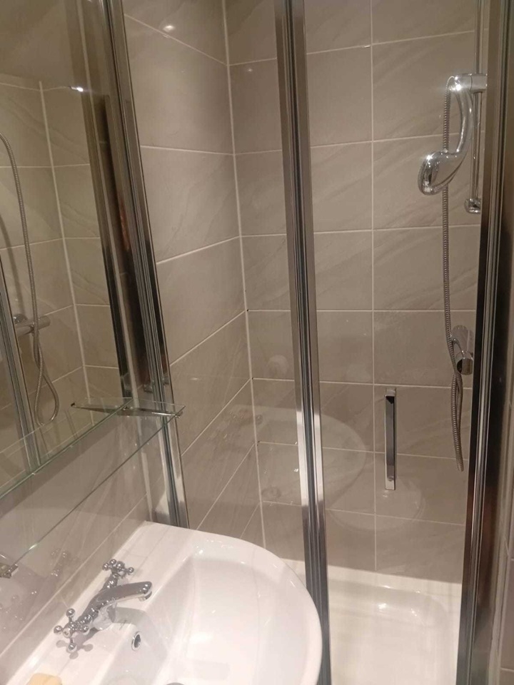 Stylish tiled en-suite: shower, toilet & basin