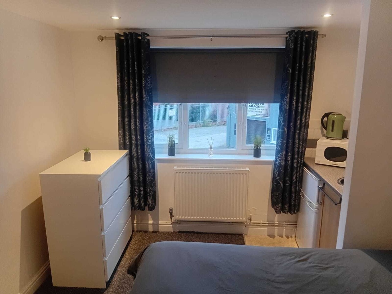 Modern kitchenette: fridge, microwave, kettle, sink & storage units