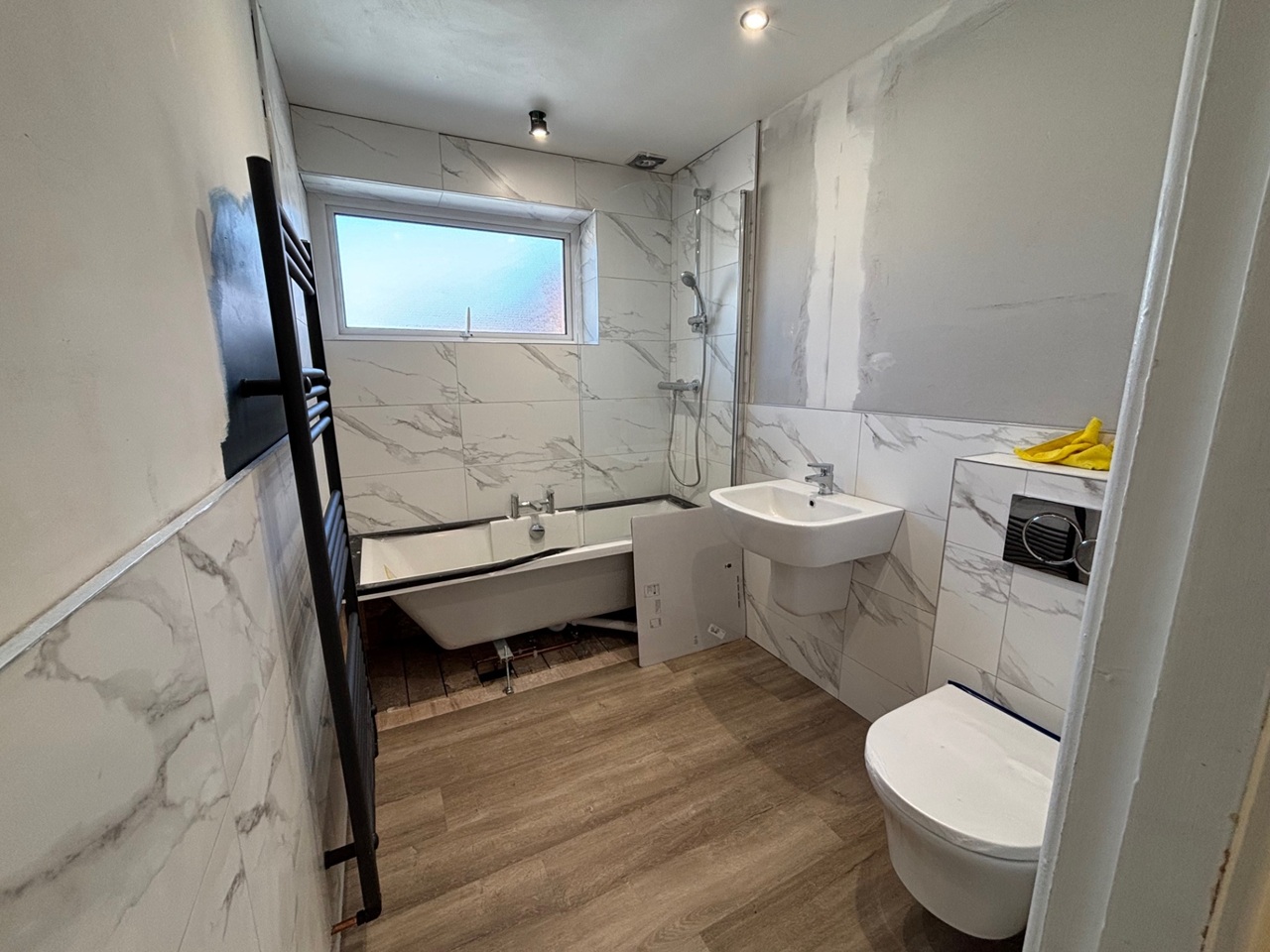 Family Bathroom - A beautifully presented brand new family bathroom comprising a white suite with large panelled bath having a mains fed shower over and glass screen, sink and enclosed cistern W.C with dual flush. The bathroom also benefits from a heated towel radiator, wall mounted cabinet and an obscured, double glazed front facing window.