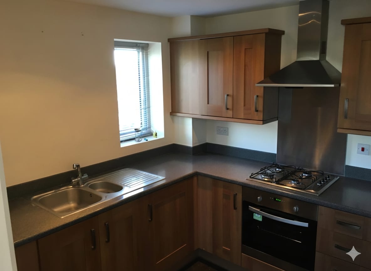 Modern Kitchen: Fully equipped with integrated appliances, including a fridge and washing machine.