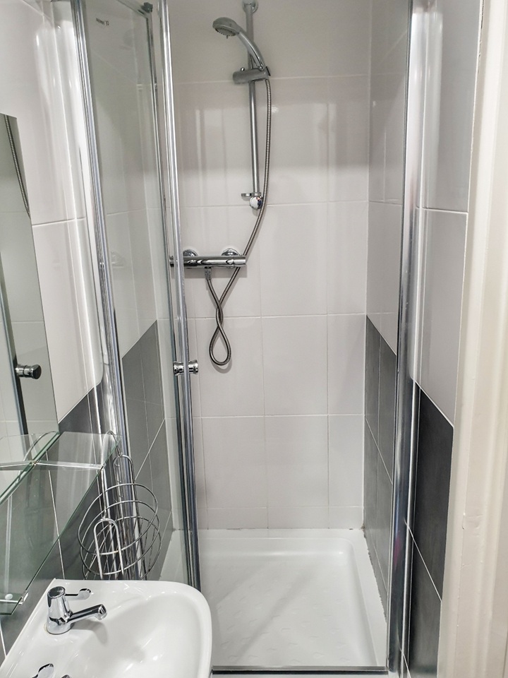 Private tiled en-suite with shower, WC & basin