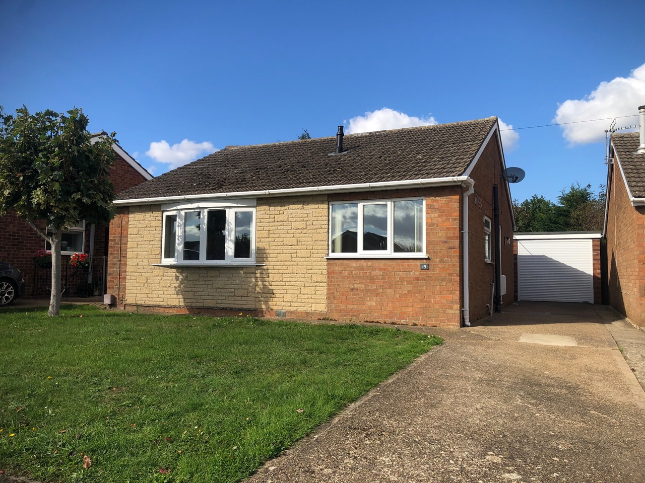 To the front of the property is a large lawned garden with an established tree, a driveway to the side of the property, and a secure large garage with electric roller shutter door. To the rear of the bungalow is a good sized private garden with two sheds providing ample storage.