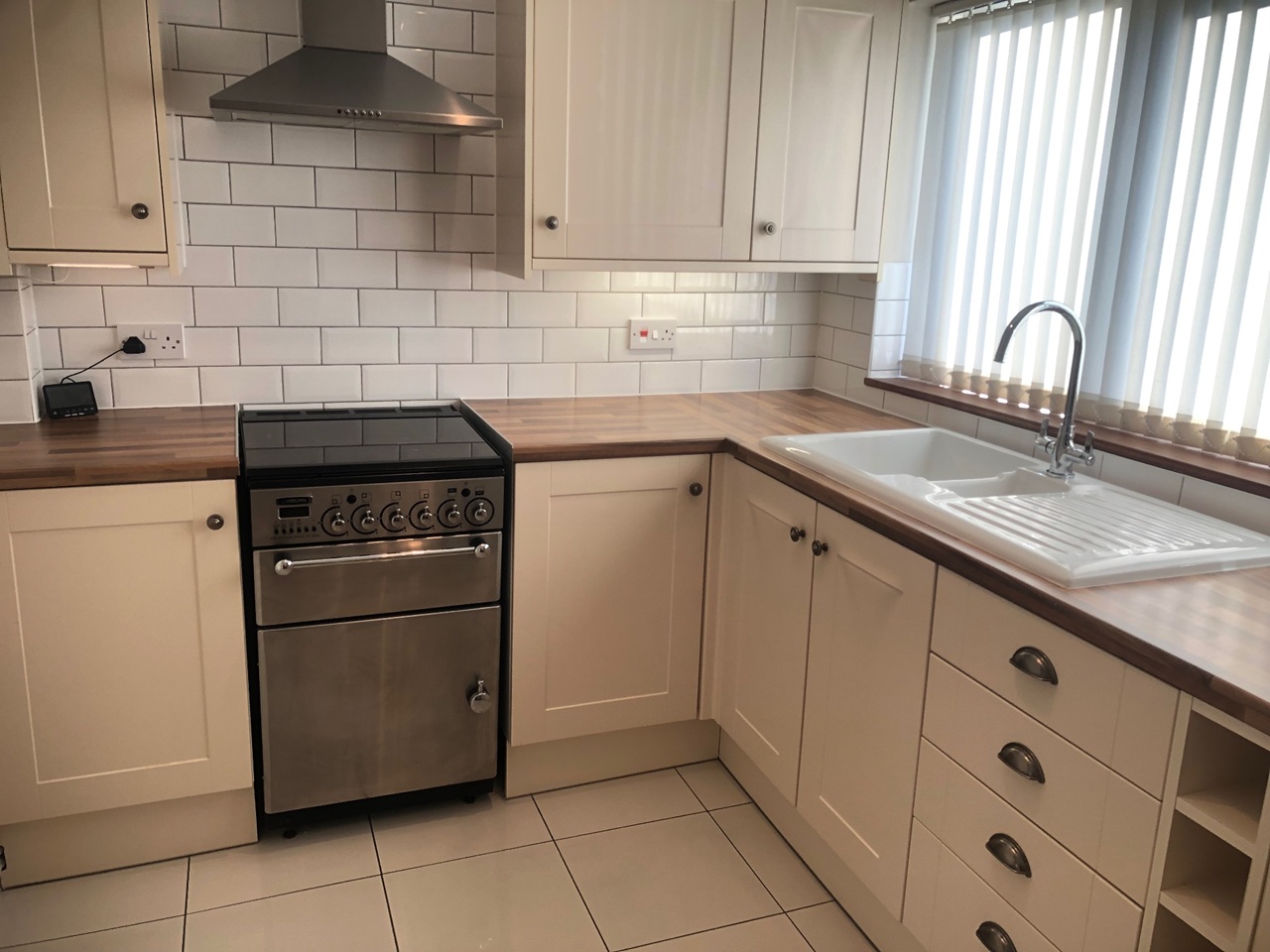 Internally the property boasts a bright entrance hallway with a composite front door and stunning white porcelain tiled floor which leads to a classic and stylish shaker style kitchen with cooker and under counter lighting. There is also large living room with stylish wall lights, a compact but well designed bathroom, and finally 2 double bedrooms and 1 single bedroom.