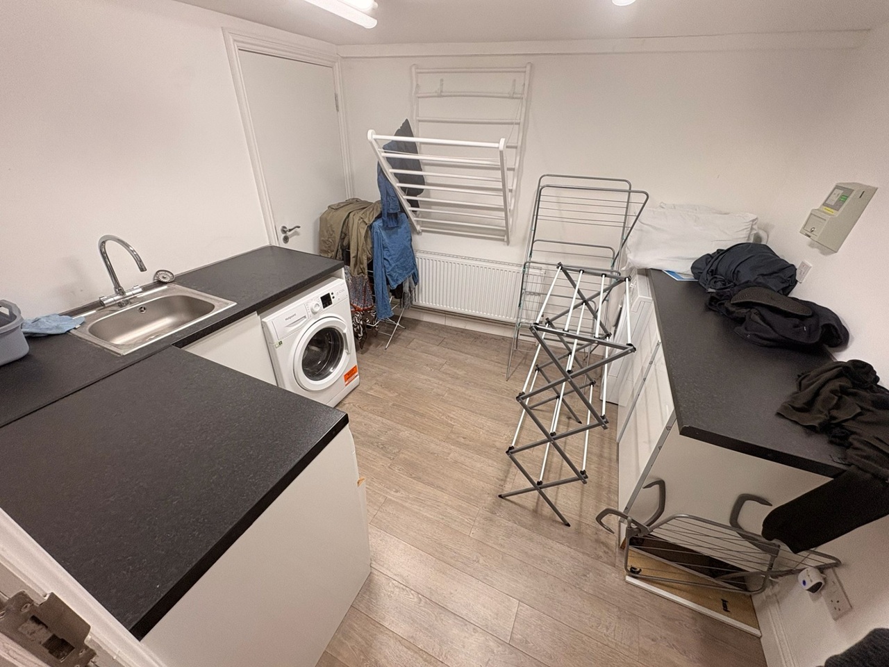 Utility room with washer, dryer & suitcase storage