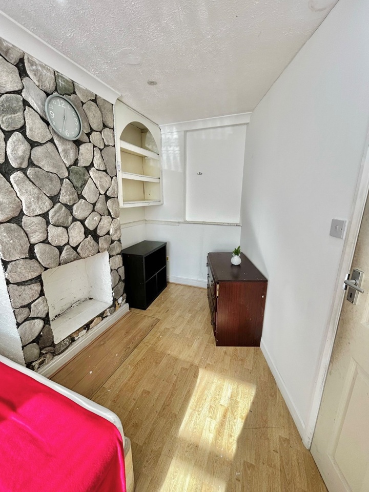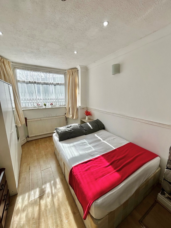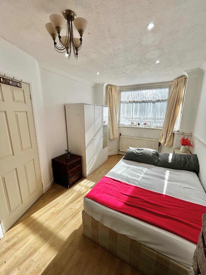 The room is fully furnished with a double bed, wardrobe and chest of drawers.