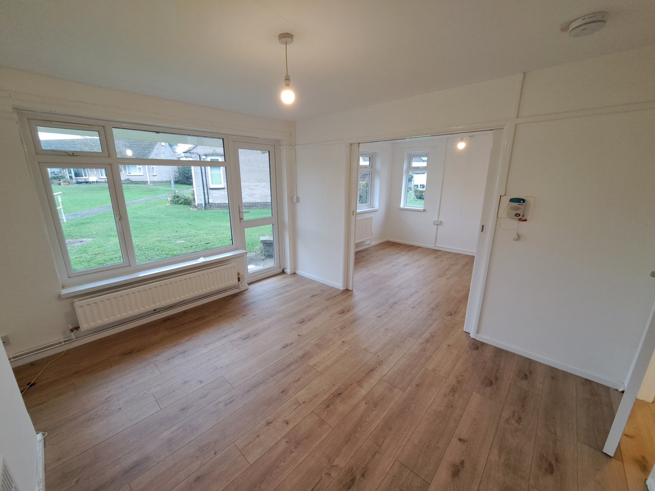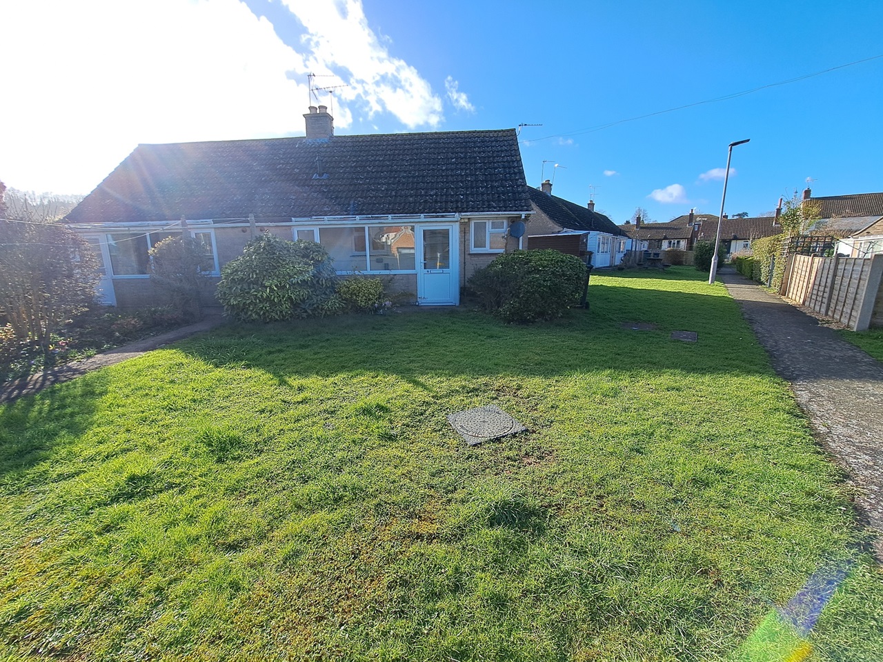 A one-bedroom semi-detached bungalow in the quiet village of Weston Under Penyard, Herefordshire. A separate kitchen with a separate walk-in storage cupboard. The master bedroom is off the main living room with dual windows allowing natural light to flood the space, separated by double sliding doors looking onto the front of the Penyard Garden cul-de-sac. The bathroom has a bath and white suite fitted. At the rear, there is a glazed garden room overlooking the communal garden, which has electricity and water and a storage cupboard.