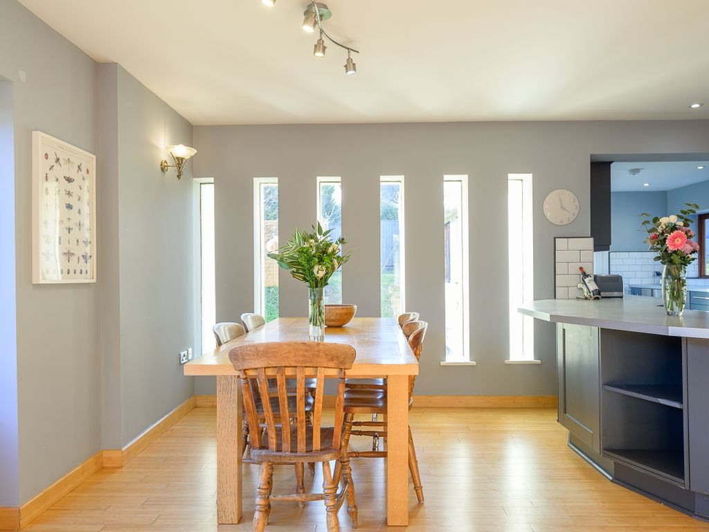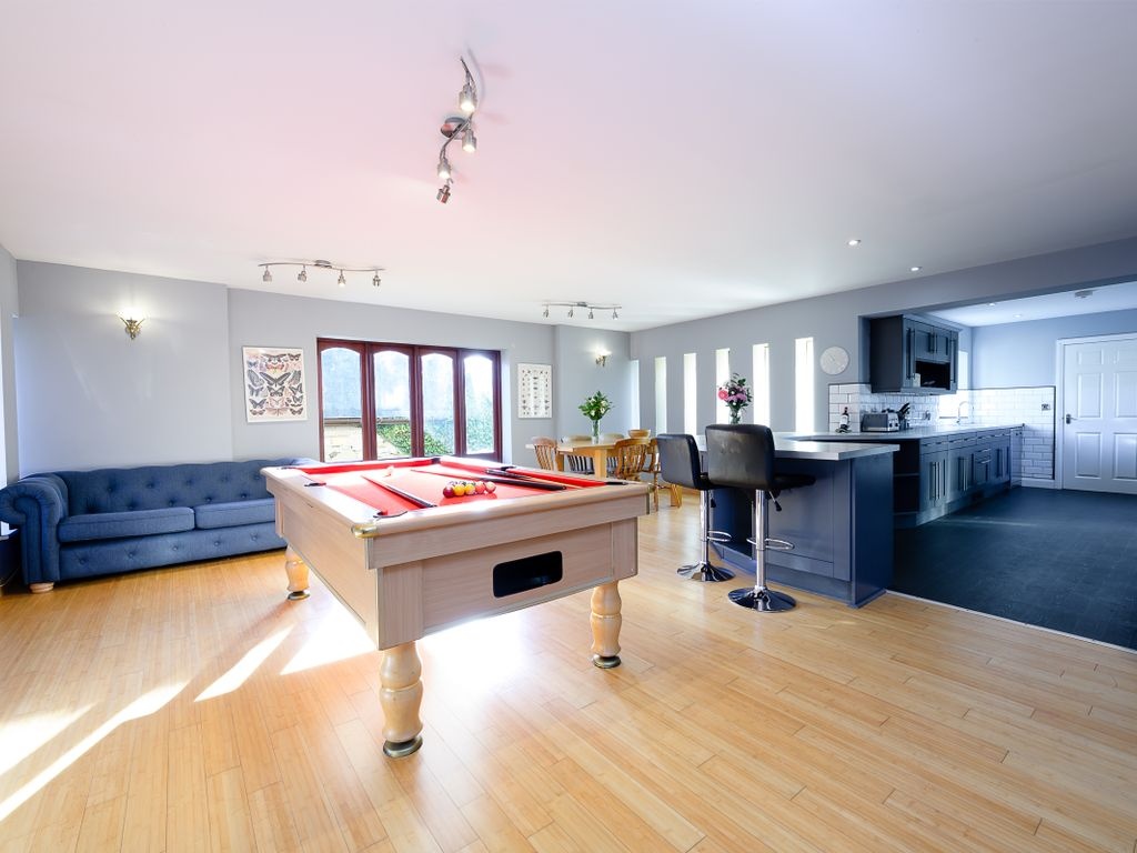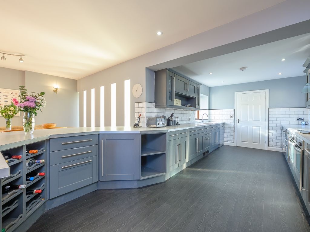 Lady of Lourdes is tucked away from the heart of the village behind a set of double gates, and the driveway offers space for around five vehicles. The home and its grounds - approximately one-quarter of an acre in size - are fully enclosed behind a stone wall and a closed-board fence, all of which help to create a sense of privacy. The main entrance leads into a spectacular reception hall which immediately sets an impressive scene. Plenty of light cascades in through a series of floor-to-ceiling windows, and the staircases leading to the first and second floors give an impression reminiscent of a labyrinth - adding a definite wow factor. A door to the left gives access to a reception room which would ideally serve as a study, snug or playroom. On the opposite side of the bright and airy reception hall, there is a cloakroom which includes a pedestal basin and a WC. A hallway, beginning in the left-hand corner, wraps around and extends towards the heart of the home. The first door - on the right-hand side - leads into an expansive sitting room. A series of slit windows, arch-shaped windows and patio doors capture a view over the garden and lead outside. Beyond the sitting room, there is a capacious open-plan living arrangement. Slit windows on either side of the formal dining area let sunshine pour in and more arch-shaped windows are positioned along the far end of the room. In terms of practicalities, the kitchen includes petrol-blue shaker-style units, including several glass-fronted doors, giving opportune spaces to display pretty crockery, particularly as these are equipped with plenty of internal lighting. There is an integrated under-counter fridge and a freezer, a double Stoves oven, a ceramic hob, an extractor fan, a double circular sink with mixer tap, a built-in wine rack and space and plumbing for a dishwasher. In addition, a breakfast bar offers an informal dining space and there is ample room for an American-style fridge/freezer.