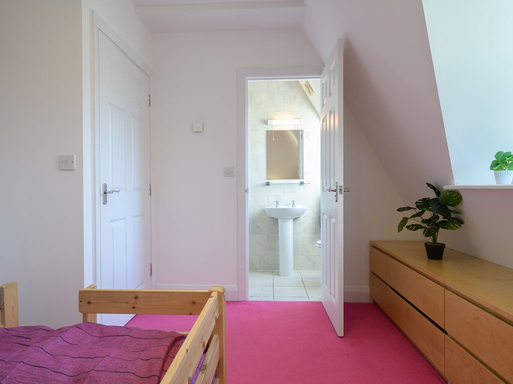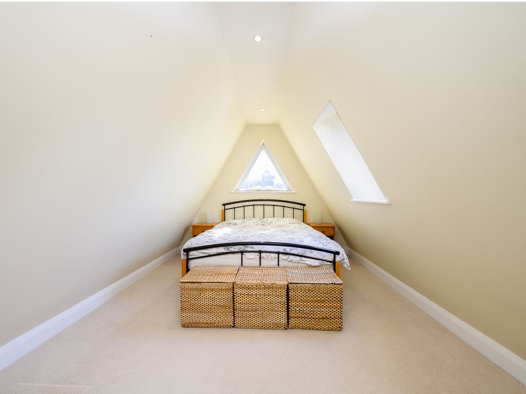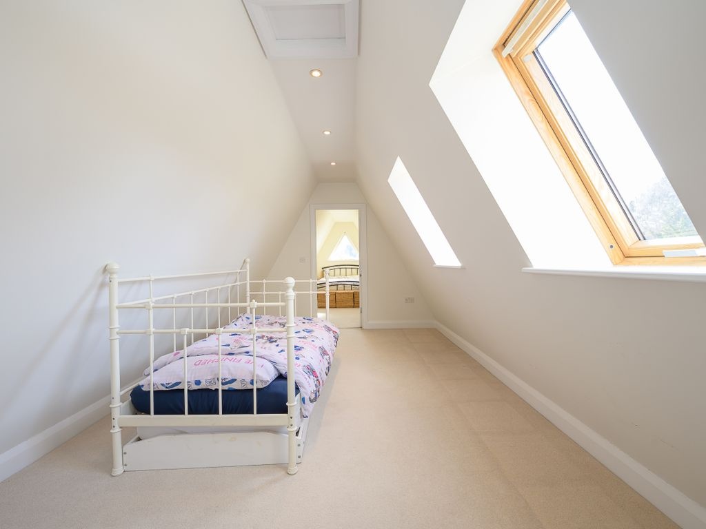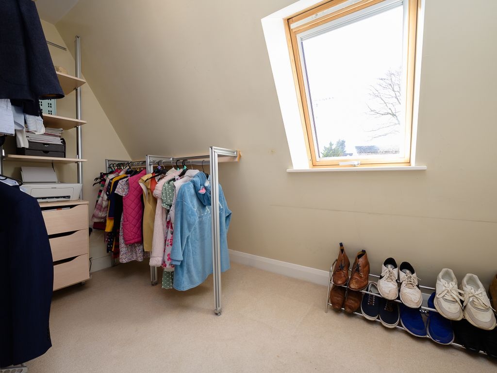 The third bedroom is large enough to accommodate a double bed and includes Velux windows. On this floor, there is the potential for sixth bedroom. One of the rooms is fitted with built-in clothes racks and therefore is used as a walk-in wardrobe but if these were to be removed, there would be space for a single bed or scope for another home office.