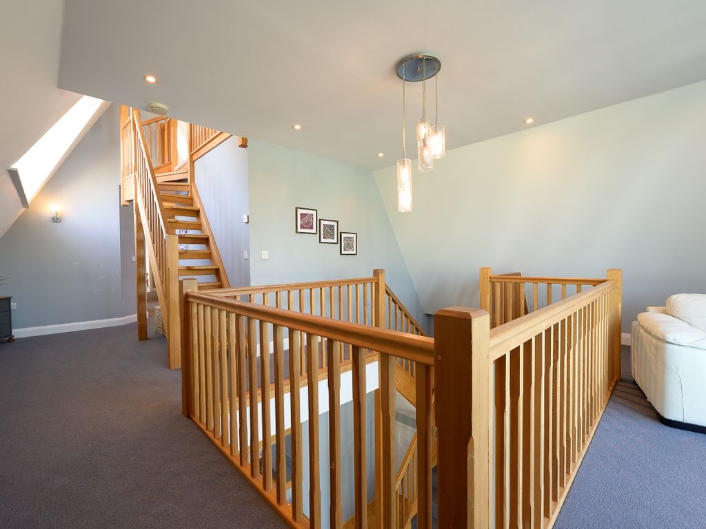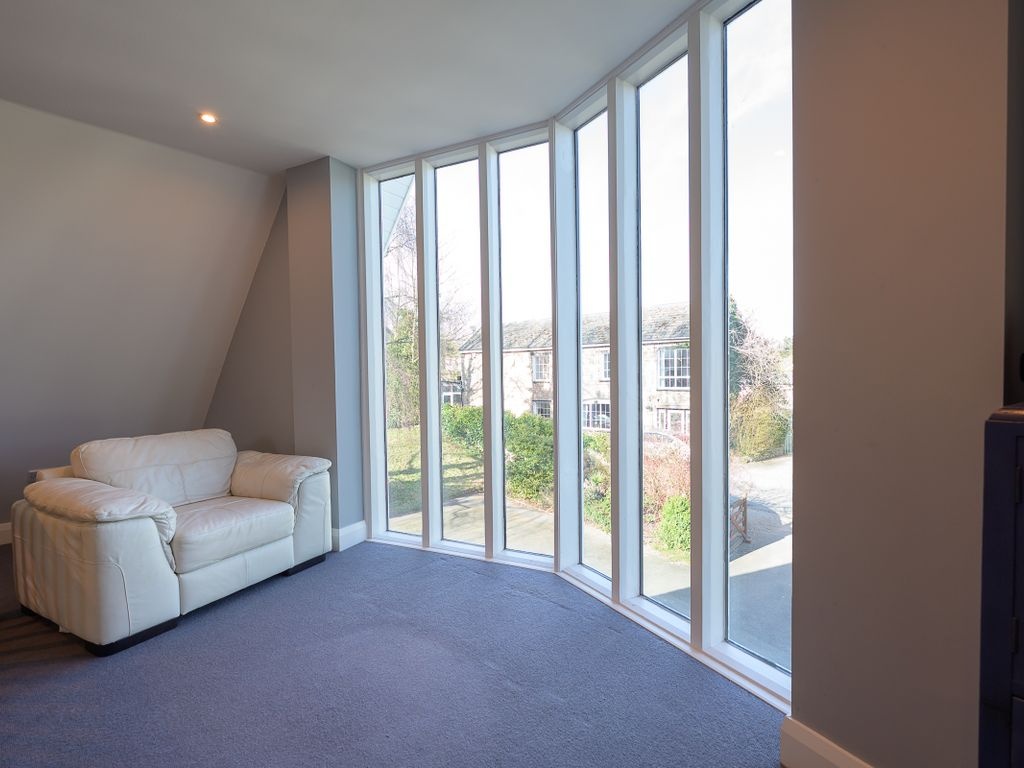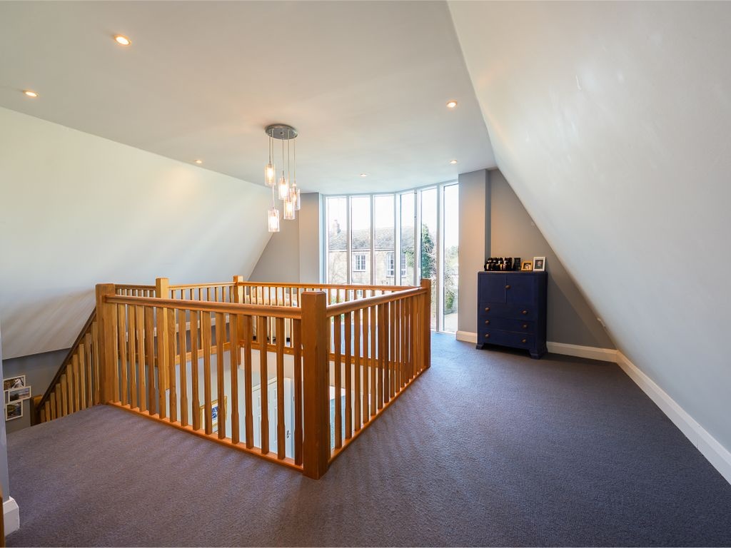 The staircase in the reception hall leads up to the first floor and its light-streamed galleried landing, which presently serves as a peaceful reading nook. Much like the reception hall below, this also features a series of full-height windows which capture an elevated view across the village and hillsides beyond. On this level of the home, there are three bedrooms, two of which boast en-suite shower rooms. Of these, one is used as the master bedroom owing to its substantial size and the fact that it also includes built-in wardrobes and cabinets.
