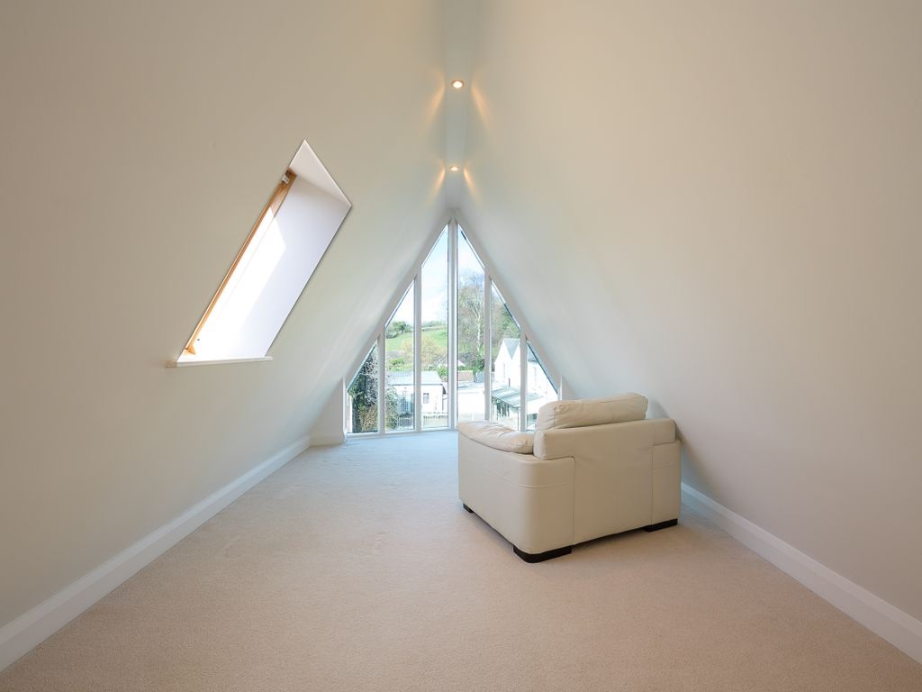On the top floor, all rooms carry splendid, vaulted ceilings. Like the floor below, the galleried landing-cum-snug has a configuration of full-height windows to let the sunlight and views flood in. There are two adjoining bedrooms on this level, although one may wish to instead establish an alternative master suite by adapting the closest bedroom to the landing into a dressing room.