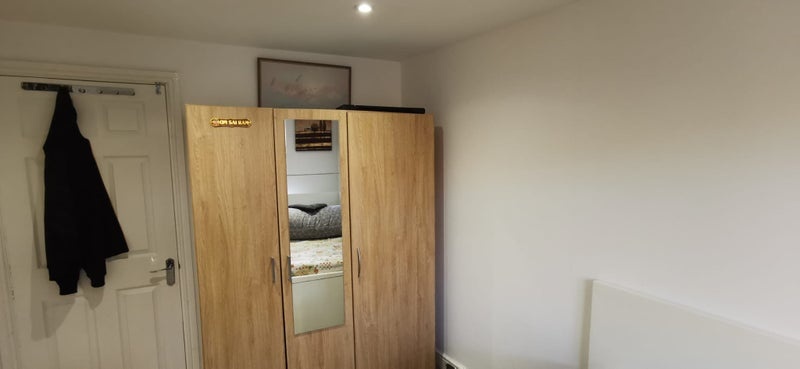 A bright and sunny room in large house. Double cupboard provided along with table and chair as well.