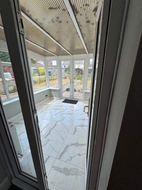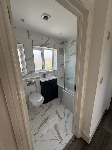 Range of matching base and eye level units with work surface over incorporating a sink drainer with hot and cold mixer taps. Integrated electric hob and overhead extractor fan. Built in electric oven and microwave, fridge freezer ,washing machine. Cupboard housing boiler. Tiled flooring.