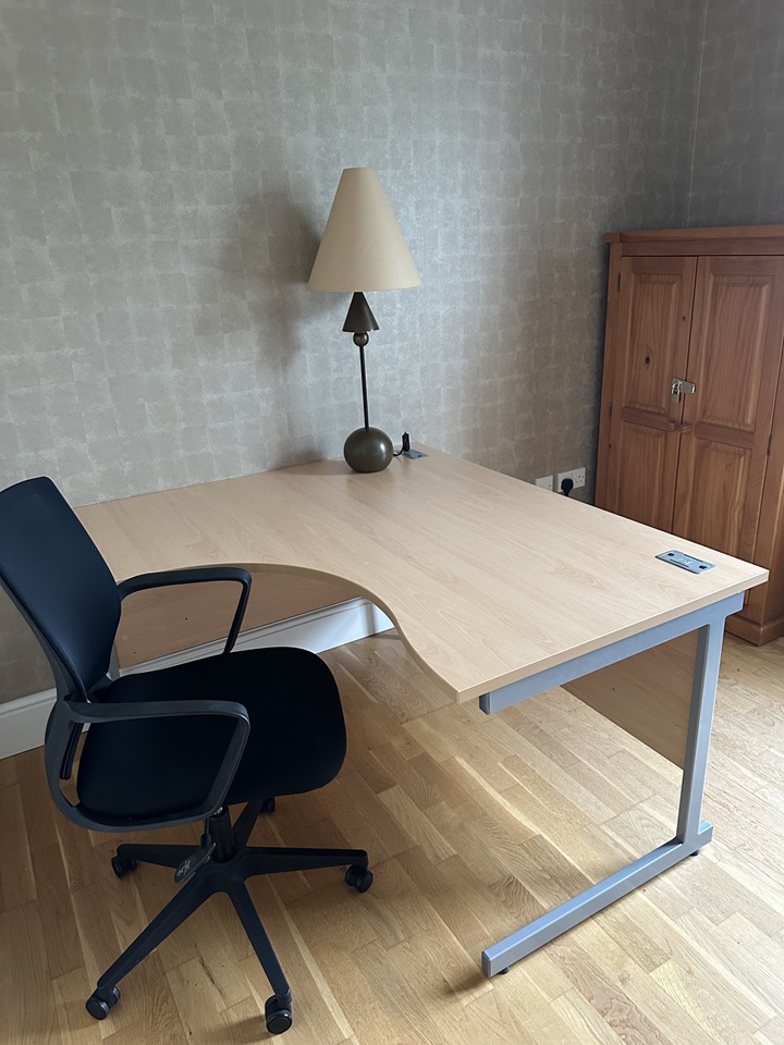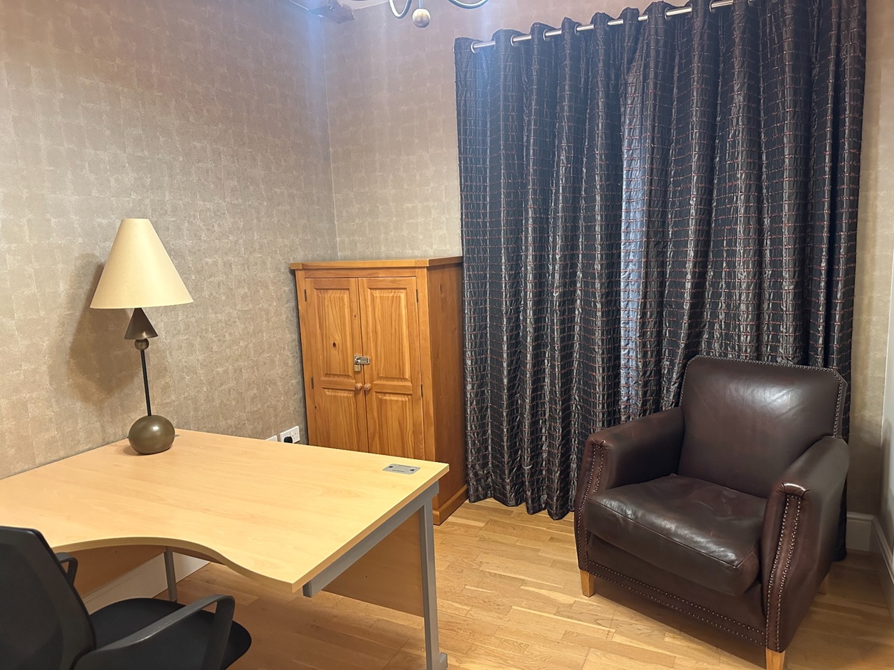 Third room set up as a home office with desk and seating
