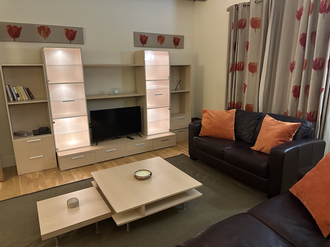 The apartment features two comfortable bedrooms plus a versatile third room set up as a home office, ideal for working remotely in comfort and style.
