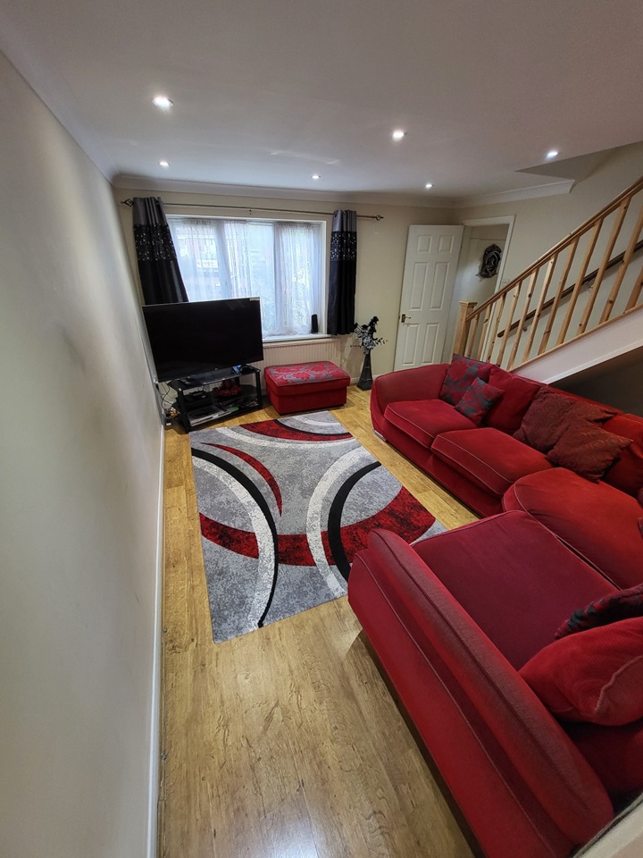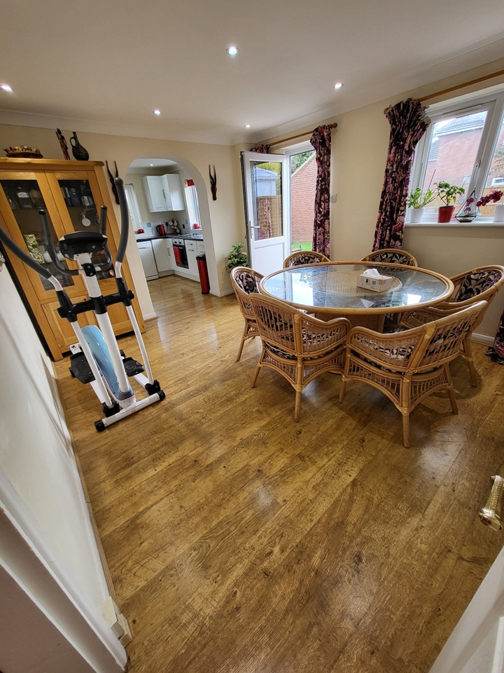 Living Room (4.23m x 3.98m): A comfortable and bright family living room, perfect for relaxing. The room features modern wood-style flooring and leads seamlessly into the dining area.