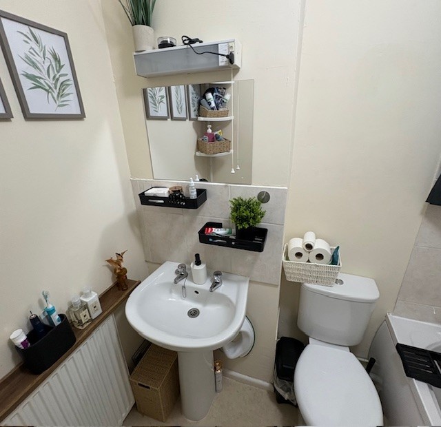 Upstairs, there are two bedrooms, one of which benefits from built-in storage, along with a family bathroom comprising a bath with shower over, hand basin, and WC.