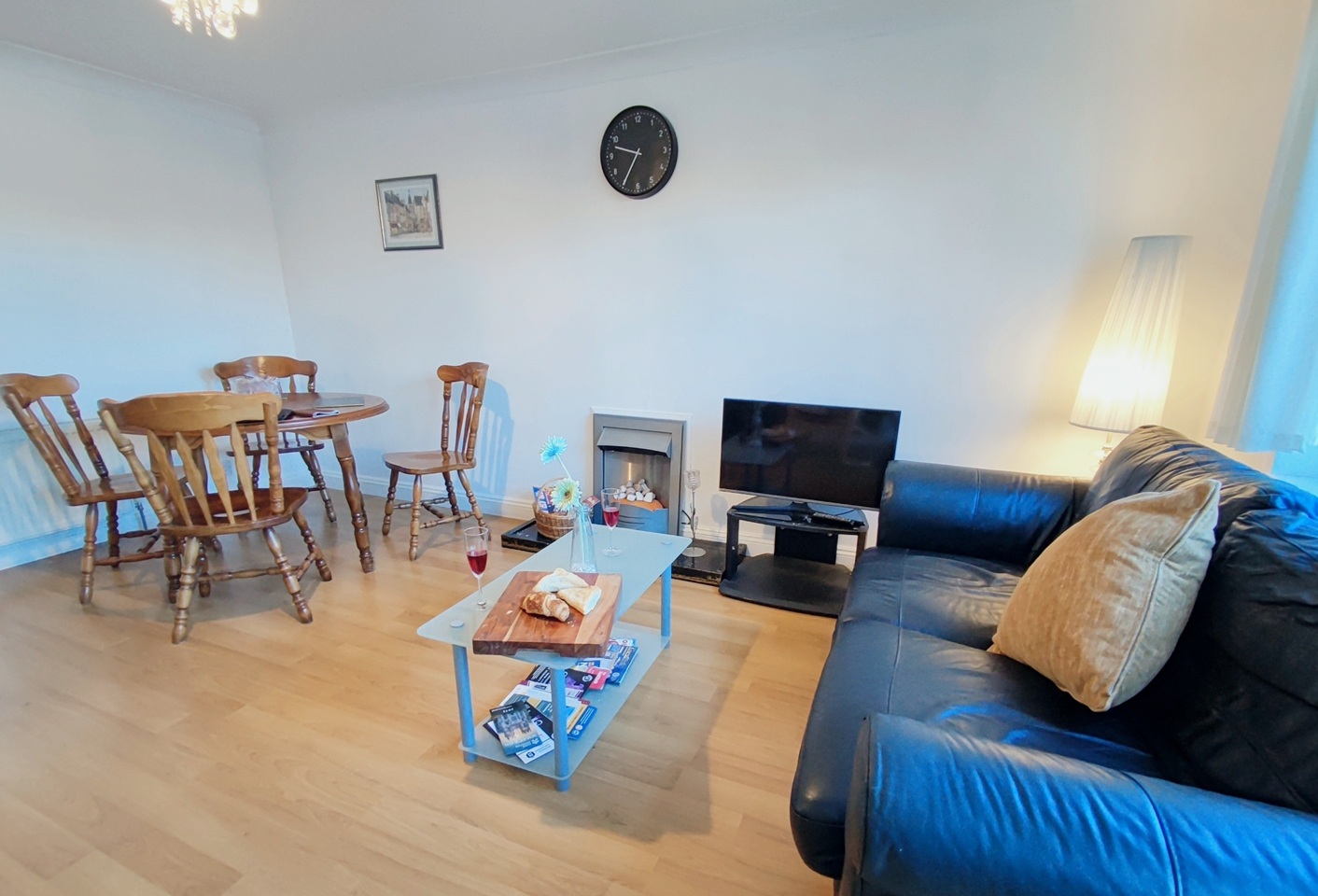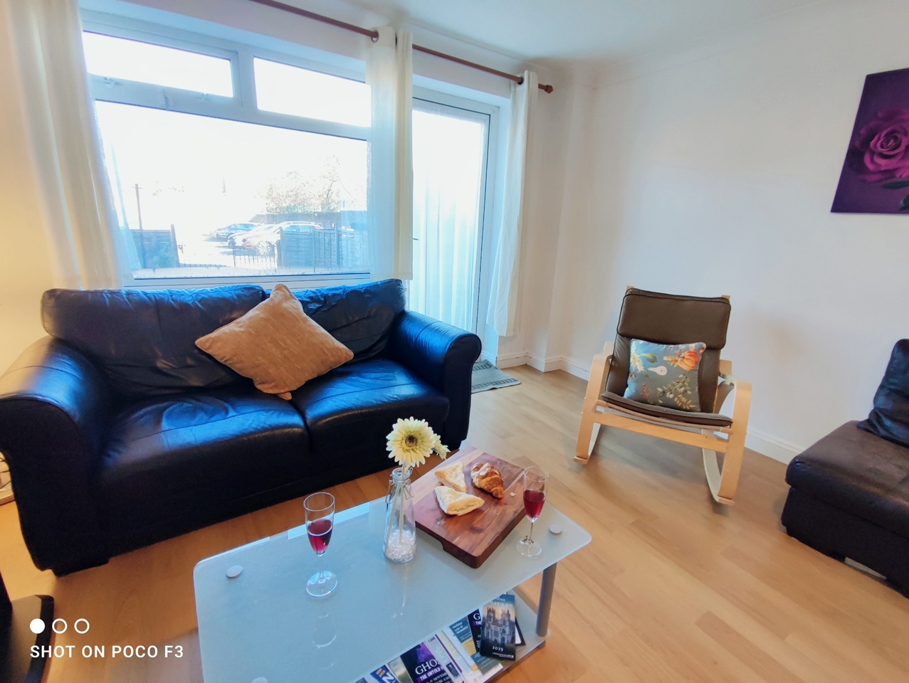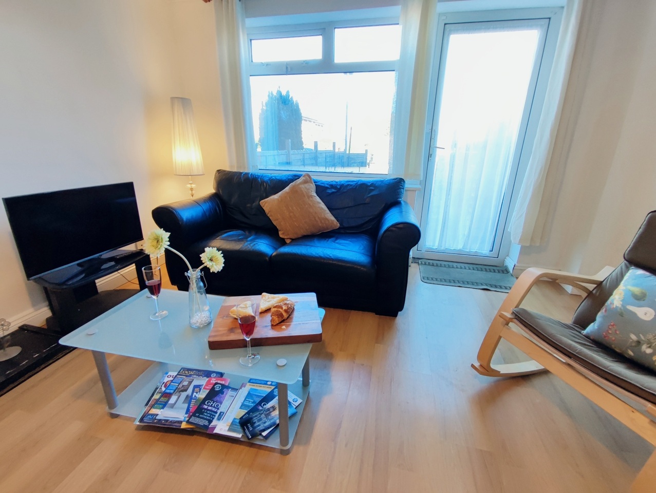 The living room is a bright and comfortable space, furnished with sofas, two Poäng chairs, a coffee table, and a TV—perfect for relaxing, studying, or socialising.