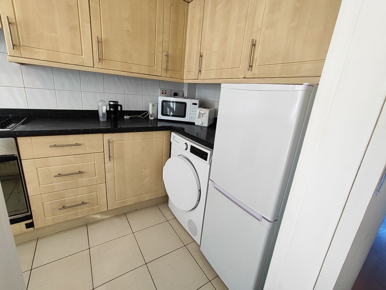One bedroom includes a double bed, and the other features a single bed. Both rooms offer ample storage space and come furnished with a wardrobe and writing desk, making them ideal for focused study and comfortable living. The kitchen is well equipped with everything you need, including a dishwasher, washer/dryer, and fridge freezer.
